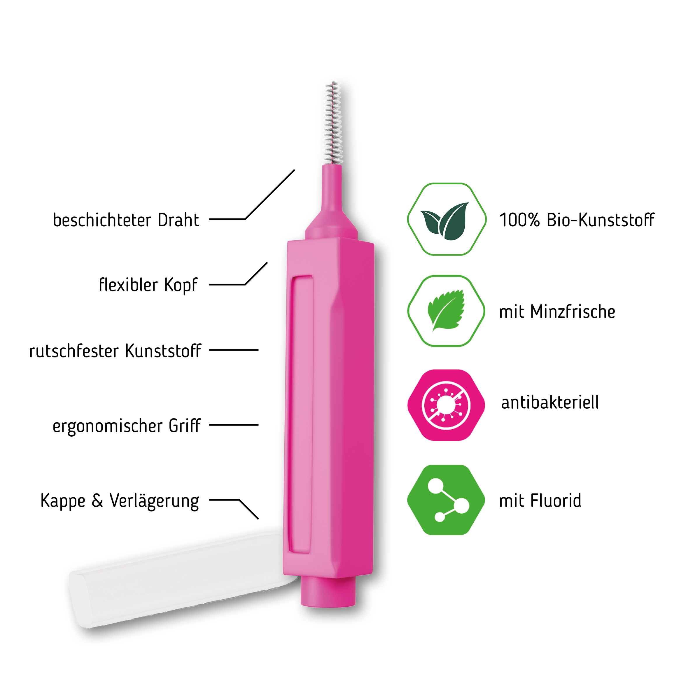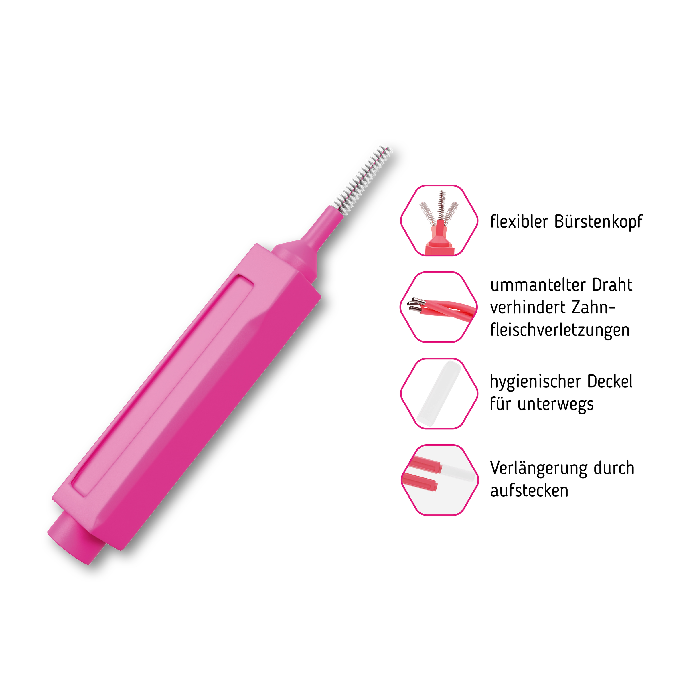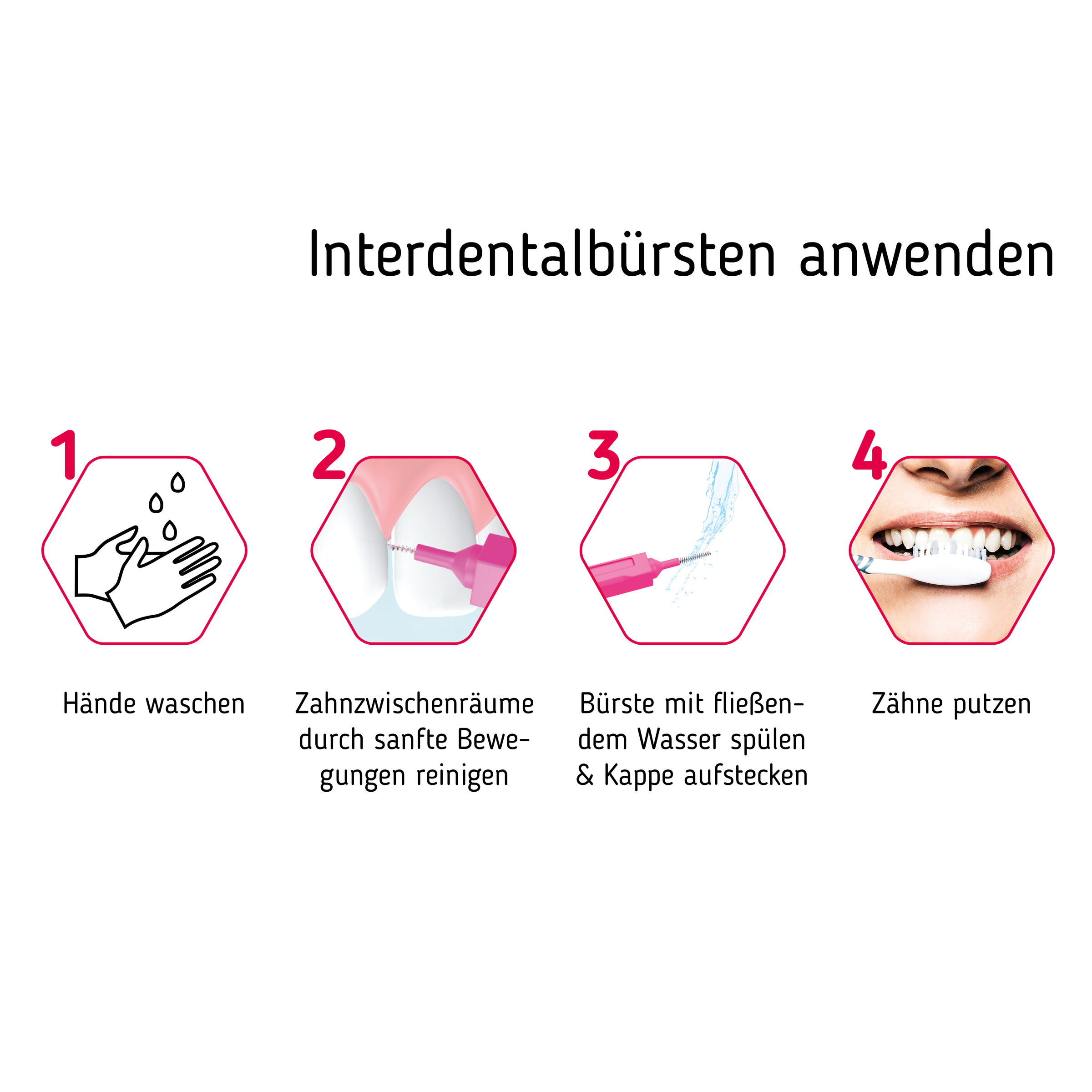 Zur gründlichen Reinigung der zahnzwischenräume die Bürste vorsichtig hin und her bewegen. Leicht biegen, nicht knicken, nicht mit Gewalt anwenden. Nach Benutzun gabspülen. Bürste täglich verwenden und auswechseln wenn abgenutzt.