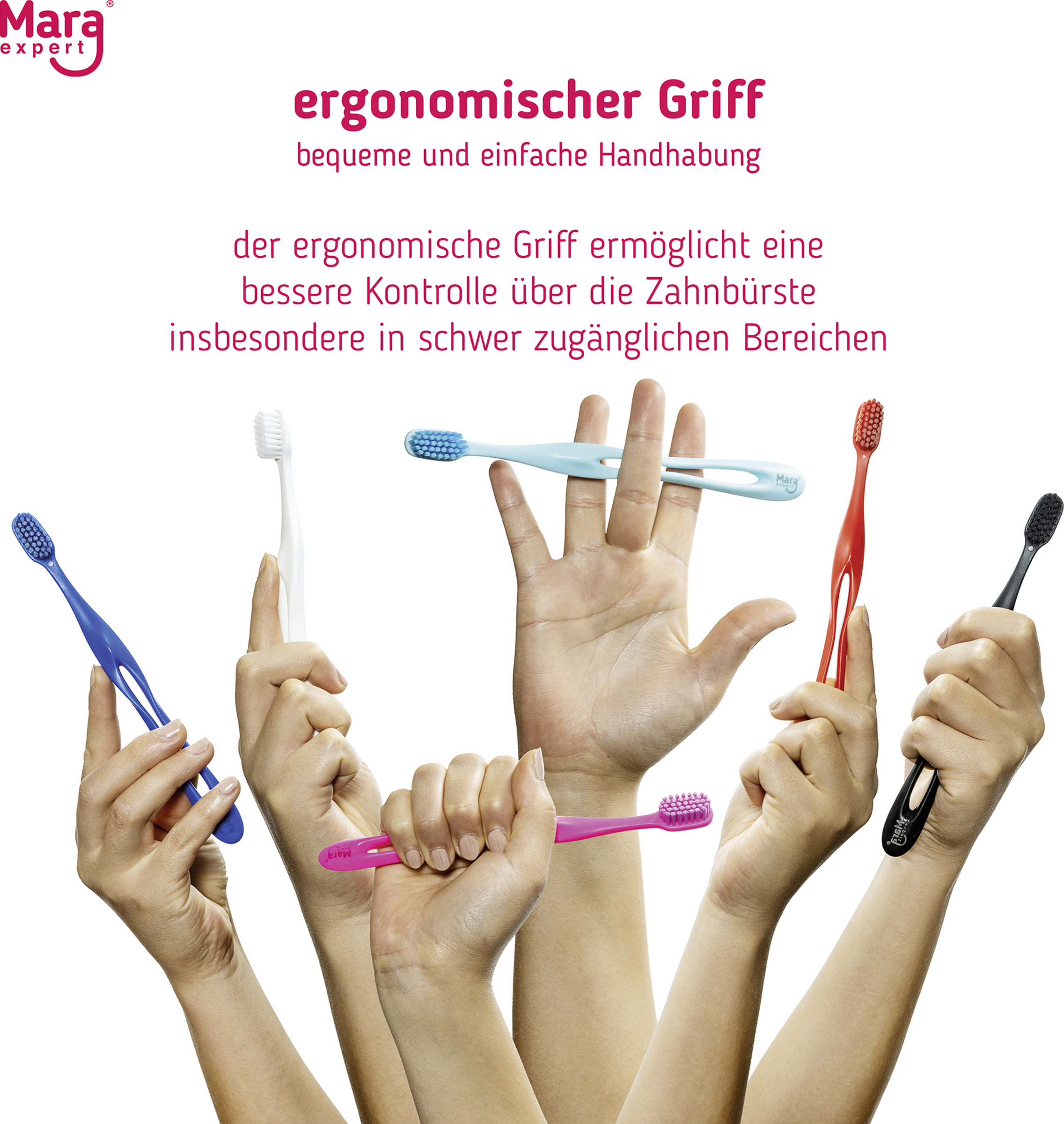 - ergonomischer Griff mit Aussparung ermöglicht eine bessere Kontrolle über die Zahnbürste insbesondere in schwer zugänglichen Bereichen