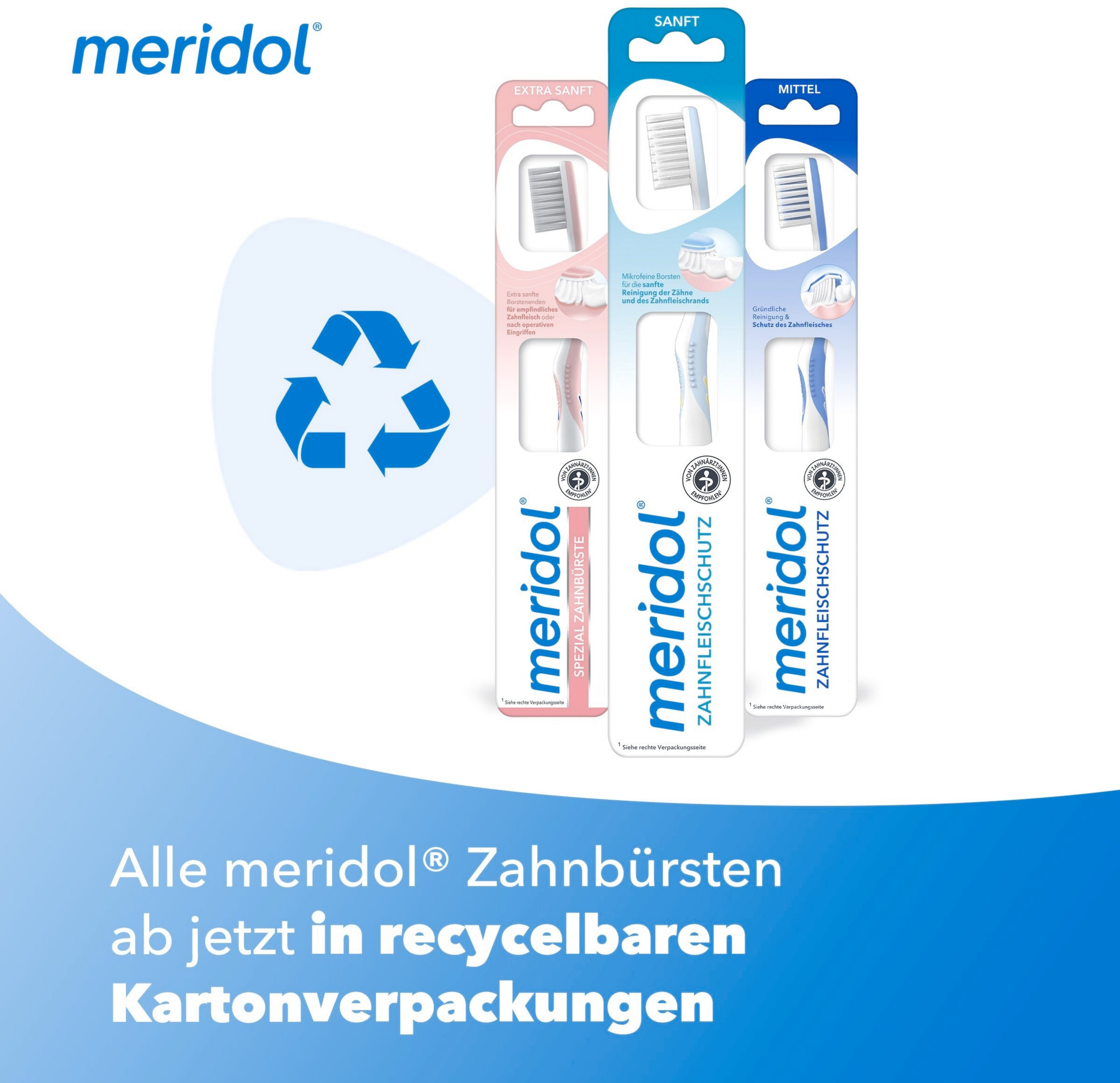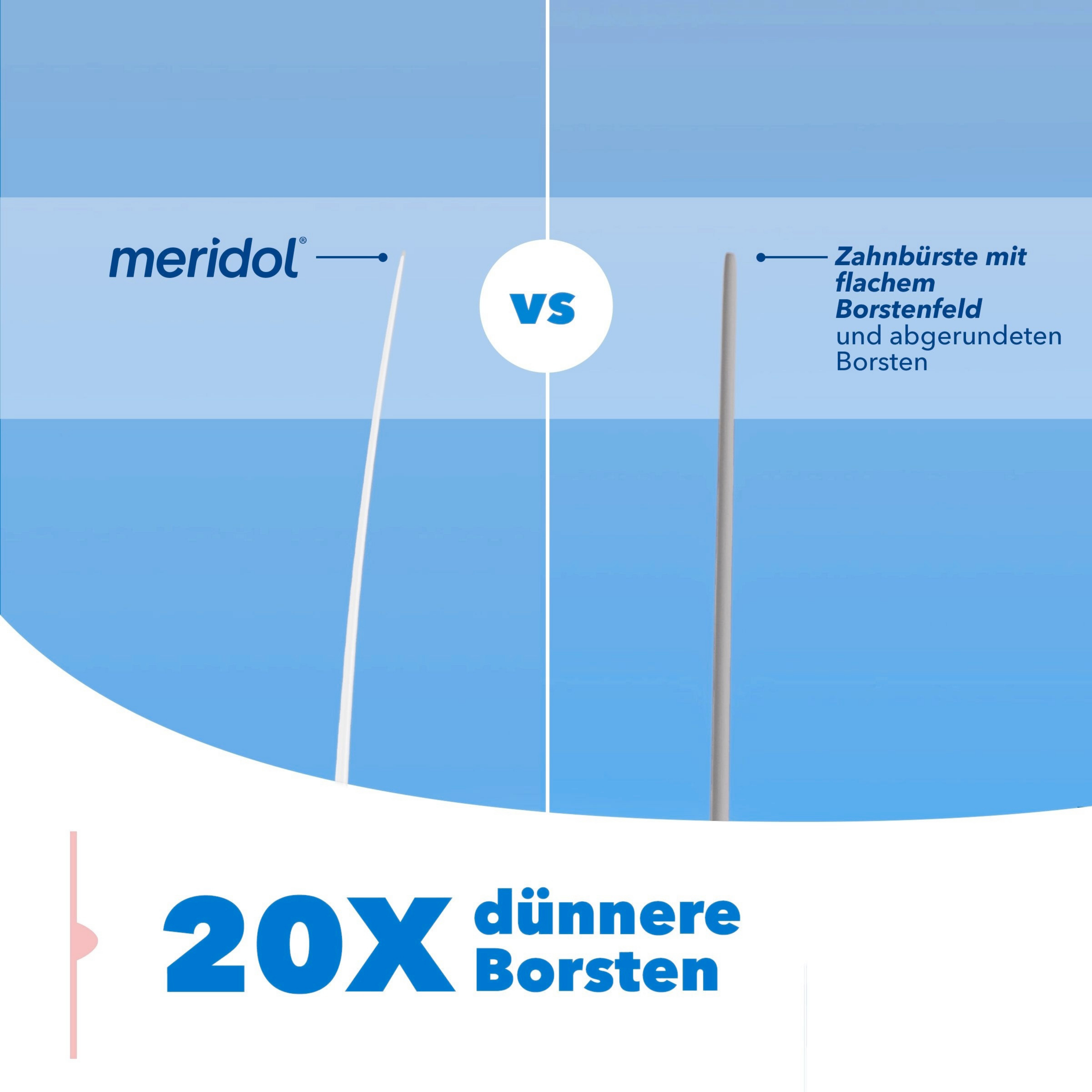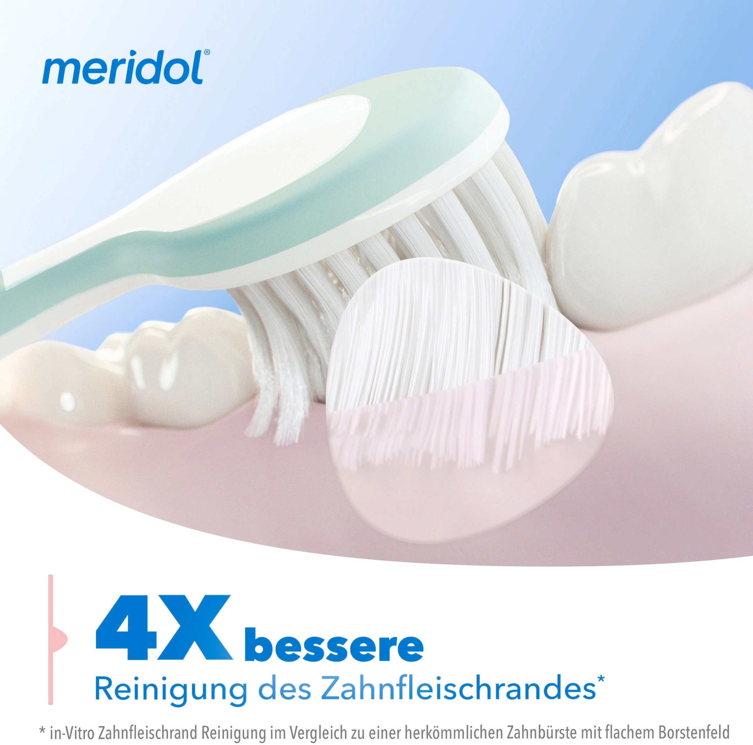 Das besondere Plus: Durch ihren extra-kleinen Bürstenkopf erreichen Sie mit der meridol Zahnfleisch sanft Zahnbürste alle Zahnflächen optimal.
