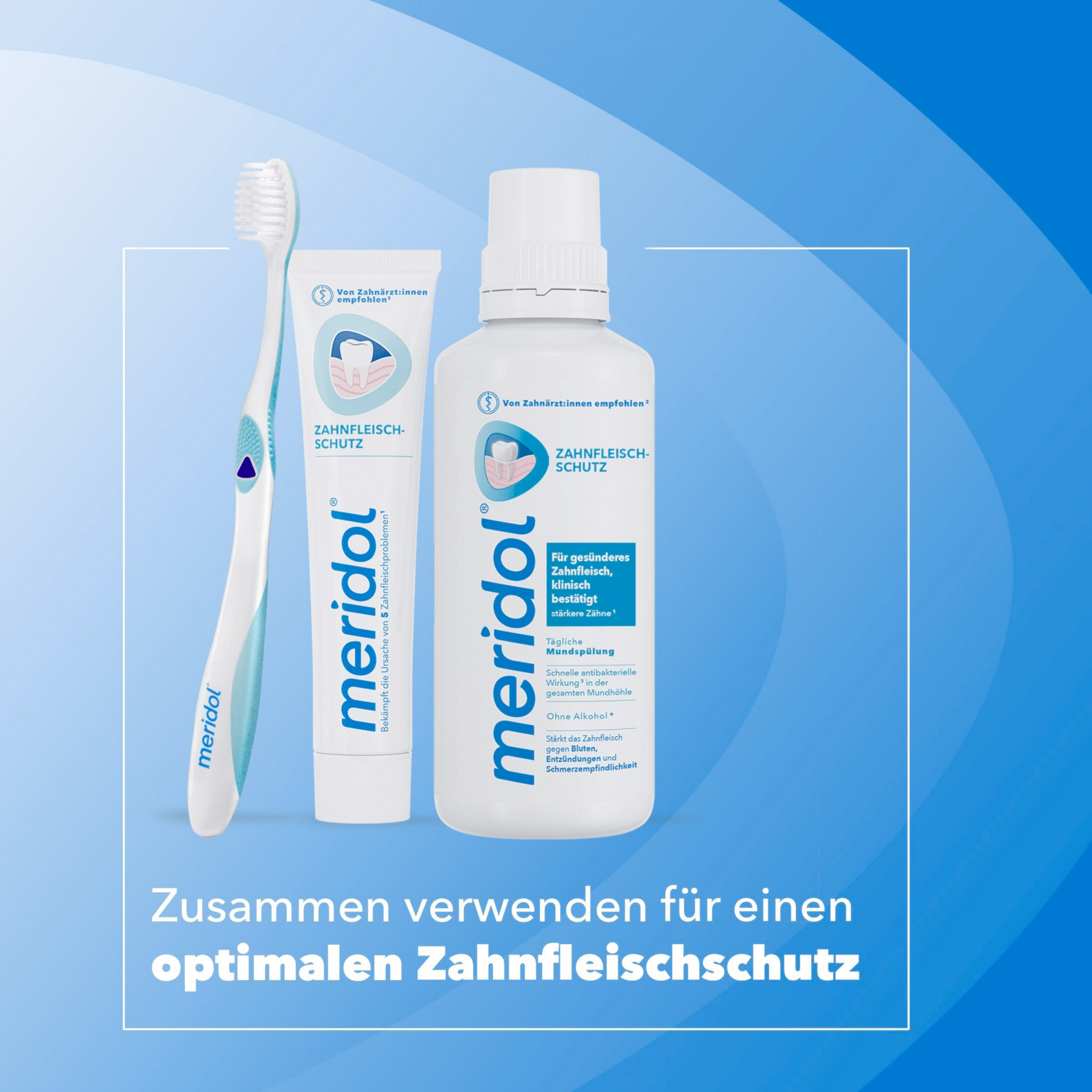 Um Ihre Pflegeroutine besonders wirksam abzurunden und Ihren Mundraum optimal vor Zahnfleischentzündungen, Plaque und Zahnstein zu schützen, empfiehlt meridol, die meridol Zahnbürste mit der meridol Zahnpasta & Mundspülung zu kombinieren.