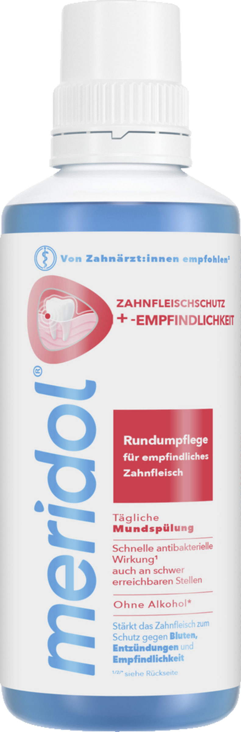 Die meridol Mundspülung Rundumpflege wurde speziell für empfindliches Zahnfleisch entwickelt. Sie kann das Zahnfleisch stärken und es vor Blutungen, Entzündungen und Empfindlichkeit schützen. Dank der 2-fach aktiven Wirkformel mit CPC und Zink wirkt sie antibakteriell und erreicht auch schwer zugängliche Stellen im Mundraum. Die Mundspülung unterstützt den Schutz vor Karies, Zahnfleischentzündungen und Parodontitis und ist dabei sanft zur Mundflora. Ohne Ethanolalkohol und für die tägliche Anwendung geeignet, sorgt sie für eine umfassende Zahnpflege und ein sauberes Mundgefühl.