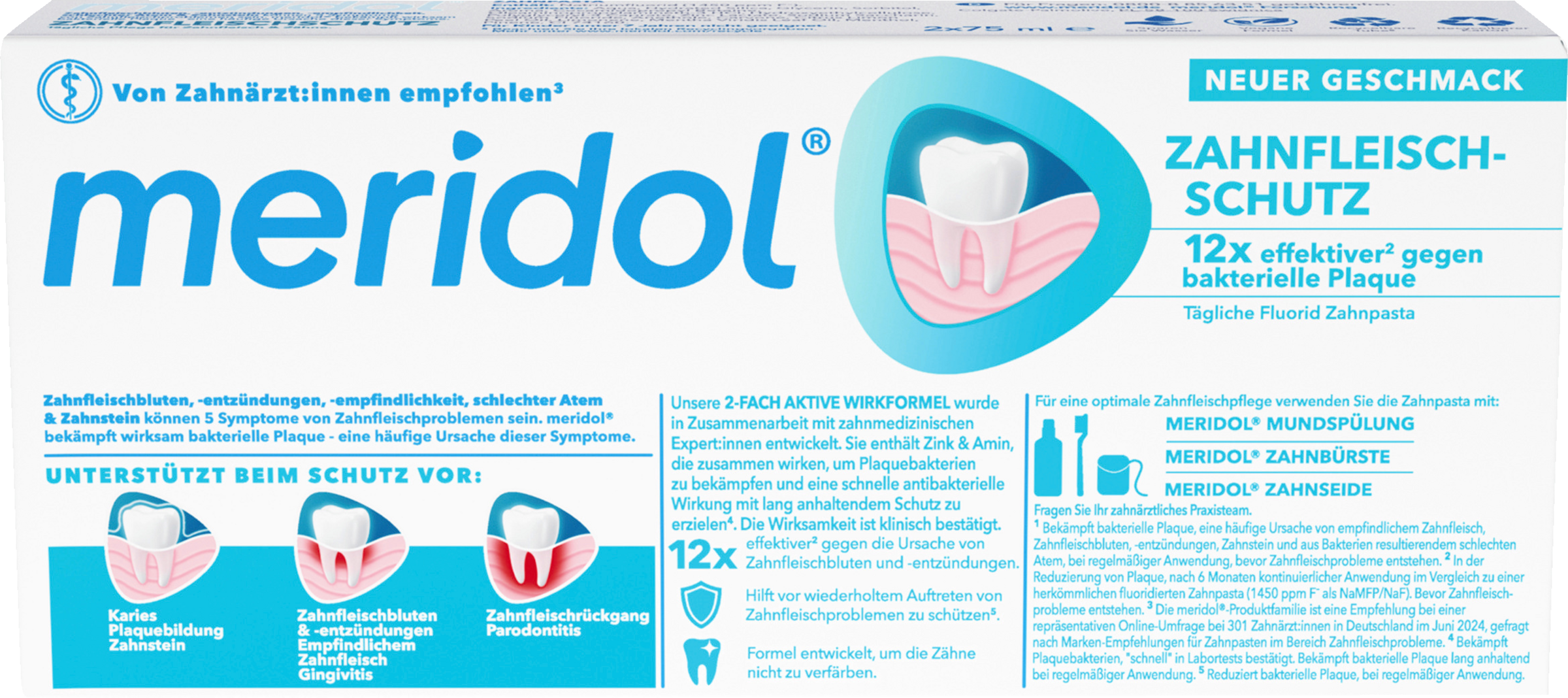 Schützen Sie Ihr Zahnfleisch, in dem Sie bei jedem Zähneputzen die meridol® Zahnfleischschutz Zahnpasta verwenden und Ihr Zahnfleisch somit gesund halten. Diese Zahnpasta hilft bei Zahnfleischproblemen und wurde entwickelt, um bakteriellen Plaque, die Ursache für 5 Zahnfleischproblemen¹, zu bekämfen: Zahnfleischbluten, Entzündungen, Empfindlichkeit, schlechter Atem, Zahnstein. Die Zahnpasta wirkt 12x effektiver² gegen die Ursache von Zahnfleischbluten und -entzündungen. Ihre Wirksamkeit ist klinisch bestätigt und sie wird von Zahnärzt:innen empfohlen³.