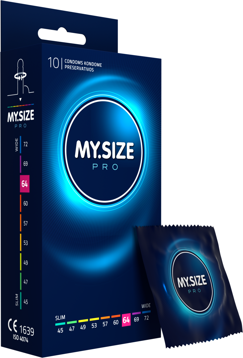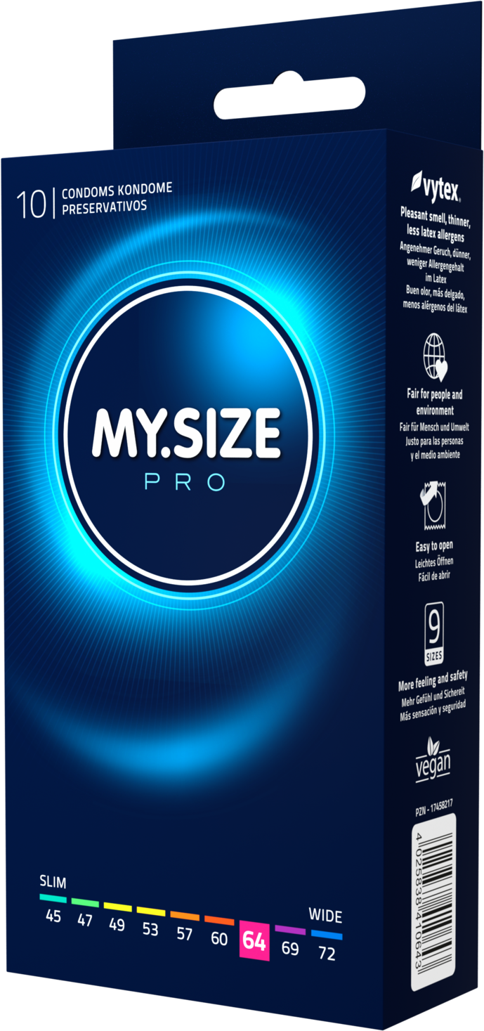 MYSIZE PRO - dünne Kondome für mehr Sicherheit durch richtigen Sitz bei gleichzeitig intensivem Gefühl. Mehr Sicherheit, durch individuell abgestimmte Paßform. Besonders allergenarm und geruchsneural durch die Verwendung von hochgradig reinem VYTEX-Latex. Die minimale Wandstärke von 0,06 bis 0,07 mm ist besonders dünn und damit besonders gefühlsecht. Nachhaltig und vegan. Weit oberhalb der Norm liegende Qaulität. Alle Kondome entsprechen der EU-Richtlinie für Medizinprodukte 93/42 EWG.← MY.SIZE PRO Kondome 64 mm, glatt, zylindrisch, transparent, mit Resrvoir, mit Gleitmittel.