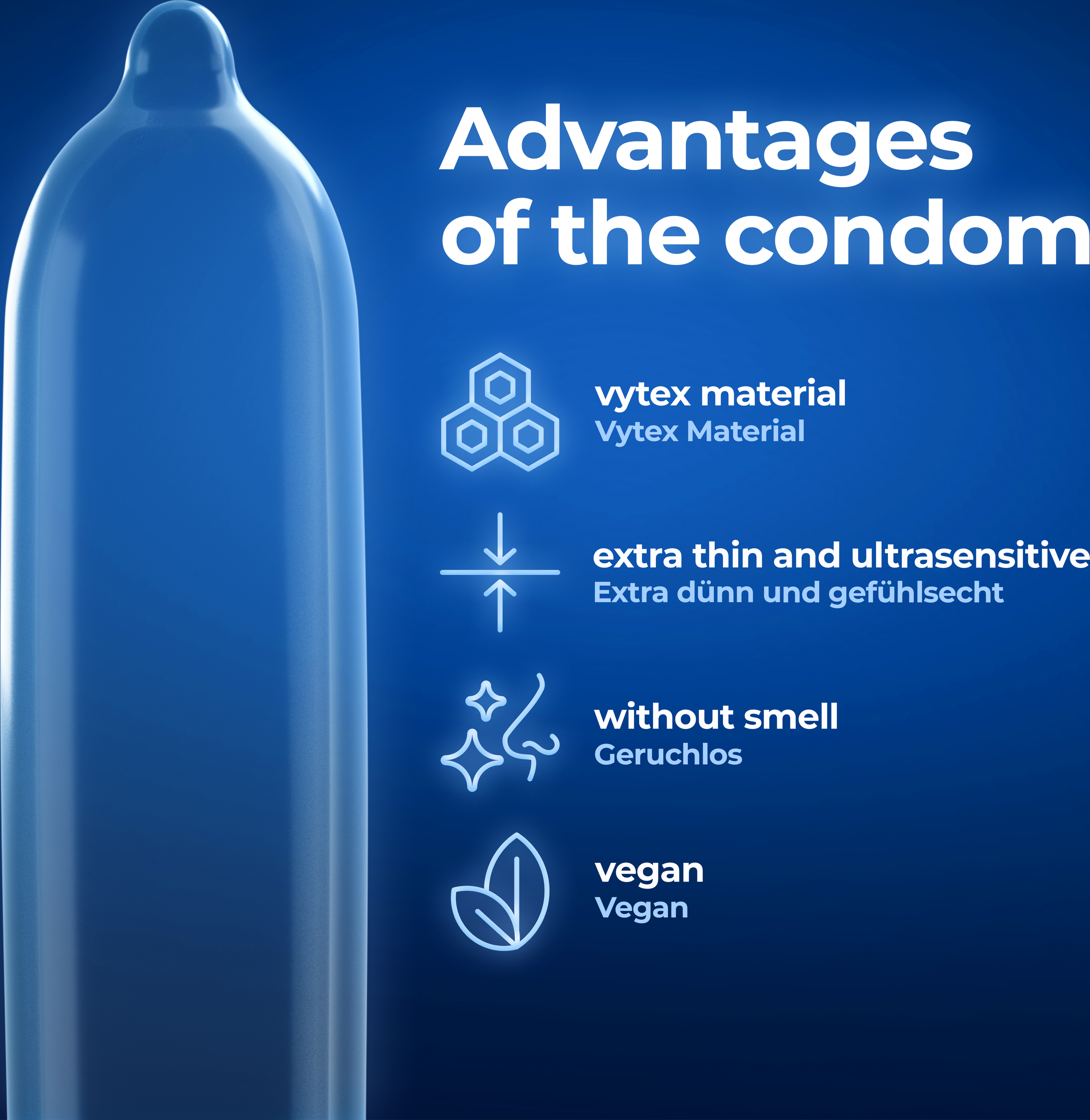 Bereits bei Entnahme aus der Verpackung ist unbedingt darauf zu achten, das Kondom vorsichtig zu behandeln, um Beschädigungen durch Fingernägel, Schmuck usw. zu vermeiden. Das Kondom muss vor dem ersten Kontakt zwischen Penis und Körper des Partners/der Partnerin über den erigierten Penis gestreift werden, um bei der Verhinderung von sexuell übertragbaren Infektionen und von Schwangerschaft unterstützend wirken zu können. Halten Sie das Reservoir an der Spitze des Kondoms so mit Daumen und Zeigefinger, dass dort kein Luftpolster entsteht. Rollen Sie das Kondom über den Penis ab. Falls Sie spüren, dass das Kondom abrutscht oder übermäßig auf dem Penis spannt, unterbrechen Sie den Liebesakt und überprüfen Sie den Sitz, da dies zu einem Riss führen kann. Eventuell müssen Sie eine andere Kondomgröße wählen. Bald nach der Ejakulation muss der Penis zurückgezogen werden, wobei das Kondom am Penisansatz festzuhalten ist.Bei Verwendung eines zusätzlichen Gleitmittels ist es erforderlich, nur solche zu verwenden, die für den Gebrauch mit Kondomen als geeignet ausgewiesen sind. Die Anwendung fetthaltiger Gleitmittel wie Vaseline, Babyöl, Körperlotionen, Massageöle, Butter, Margarine usw. ist zu vermeiden, da diese die Unversehrtheit des Kondoms beeinträchtigen.Bei gleichzeitiger Anwendung von Medikamenten, die in Kontakt mit dem Kondom kommen können, ist es erforderlich, einen Arzt oder Apotheker zu deren Verträglichkeit zu konsultieren.Sollte ein Kondom während des Gebrauchs undicht werden oder bersten, suchen Sie möglichst schnell medizinische Hilfe, mindestens innerhalb von 72 Stunden.Wenn die Einzelpackung offensichtlich beschädigt ist, das Kondom verwerfen und ein neues Kondom aus einer unbeschädigten Packung verwenden. Entsorgen Sie das gebrauchte Kondom im Abfalleimer und nicht in der Toilette. Verwenden Sie das Kondom nur einmal, da bei Wiederverwendung ein erhöhtes Risiko für ein Versagen oder für eine Infektion gegeben ist.