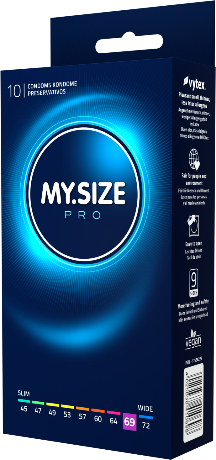 MYSIZE PRO - dünne Kondome für mehr Sicherheit durch richtigen Sitz bei gleichzeitig intensivem Gefühl. Mehr Sicherheit, durch individuell abgestimmte Paßform. Besonders allergenarm und geruchsneural durch die Verwendung von hochgradig reinem VYTEX-Latex. Die minimale Wandstärke von 0,06 bis 0,07 mm ist besonders dünn und damit besonders gefühlsecht. Nachhaltig und vegan. Weit oberhalb der Norm liegende Qaulität. Alle Kondome entsprechen der EU-Richtlinie für Medizinprodukte 93/42 EWG.← MY.SIZE PRO Kondome 69 mm, glatt, zylindrisch, transparent, mit Resrvoir, mit Gleitmittel.