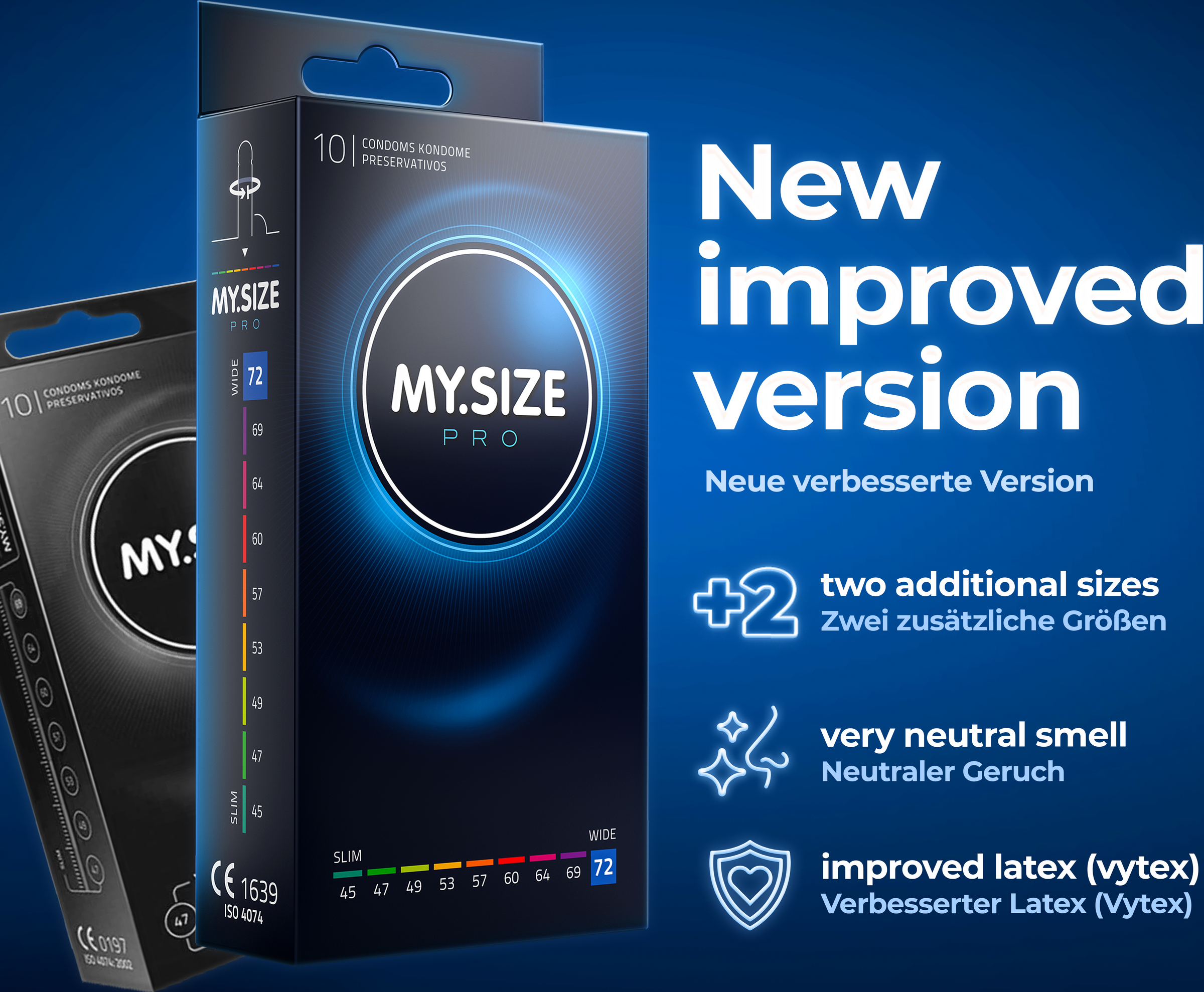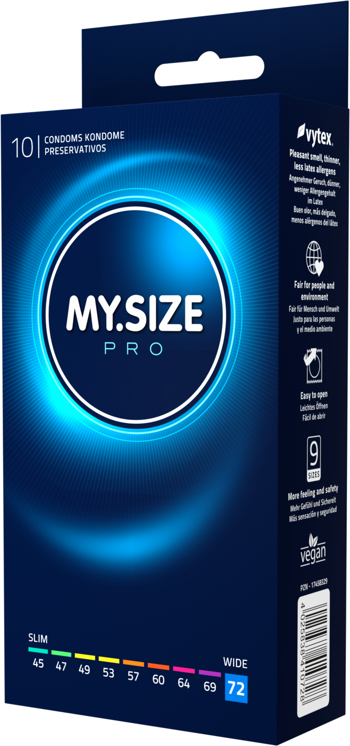MYSIZE PRO - dünne Kondome für mehr Sicherheit durch richtigen Sitz bei gleichzeitig intensivem Gefühl. Mehr Sicherheit, durch individuell abgestimmte Paßform. Besonders allergenarm und geruchsneural durch die Verwendung von hochgradig reinem VYTEX-Latex. Die minimale Wandstärke von 0,06 bis 0,07 mm ist besonders dünn und damit besonders gefühlsecht. Nachhaltig und vegan. Weit oberhalb der Norm liegende Qaulität. Alle Kondome entsprechen der EU-Richtlinie für Medizinprodukte 93/42 EWG.← MY.SIZE PRO Kondome 72 mm, glatt, zylindrisch, transparent, mit Resrvoir, mit Gleitmittel.
