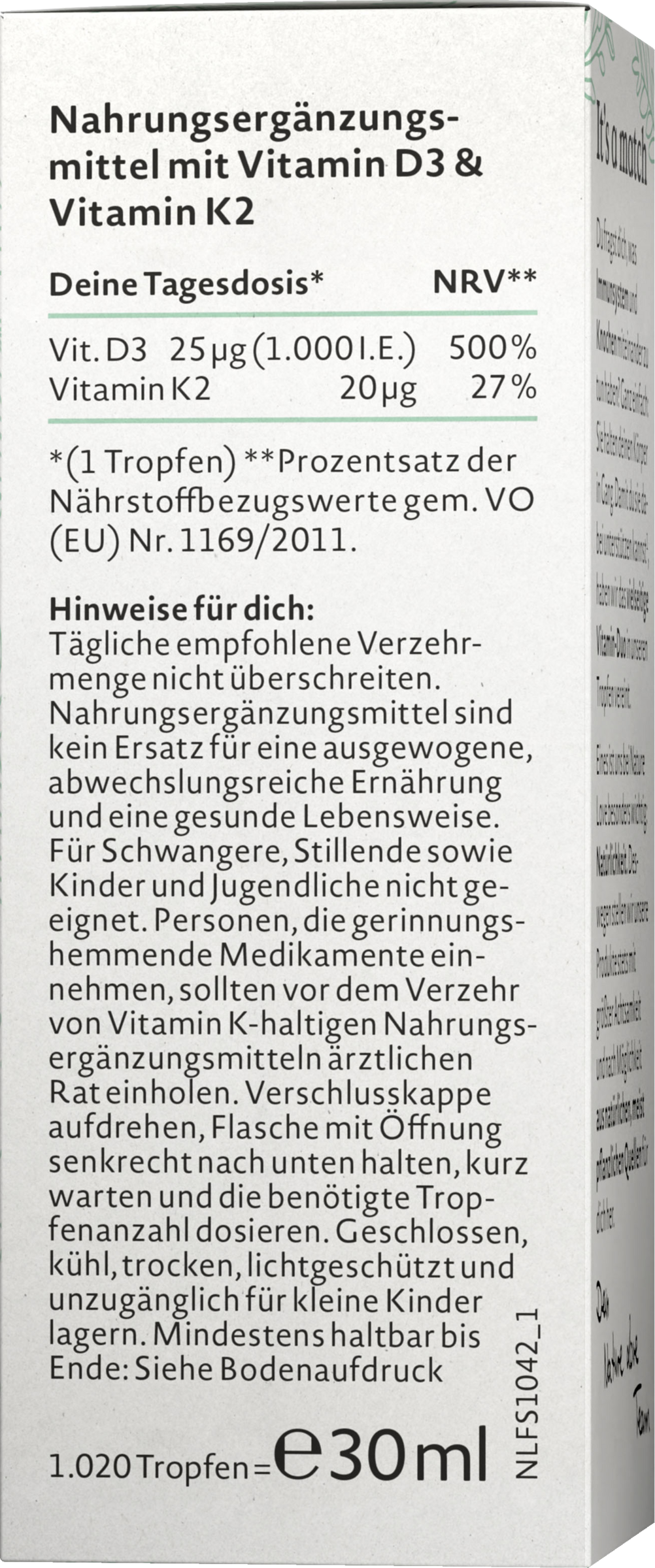 - 25 µg Vitamin D3 und 20 µg Vitamin K2 je Tagesdosis (1 Tropfen)