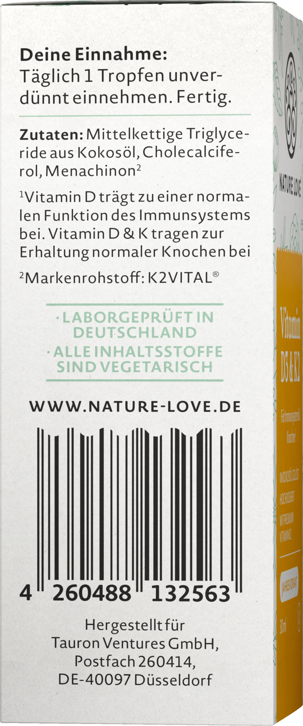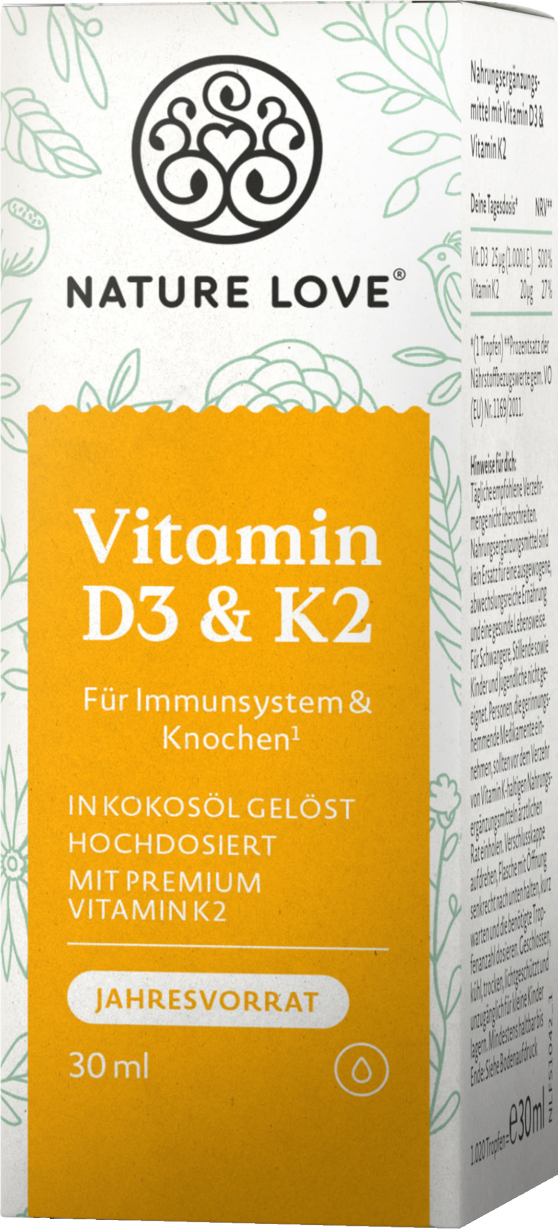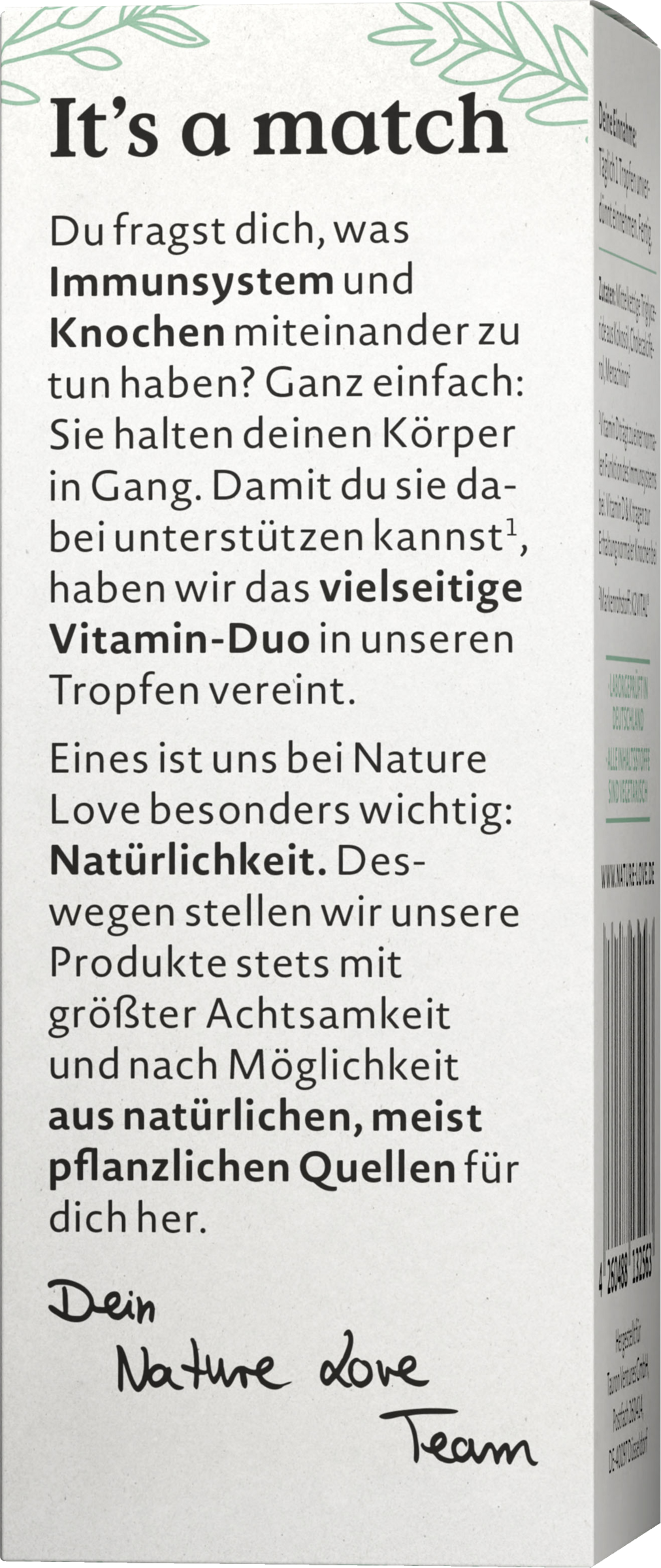 Du fragst dich, was Immunsystem und Knochen miteinander zu tun haben? Ganz einfach: Sie halten deinen Körper in Gang. Damit du sie dabei unterstützen kannst,* hat Nature Love das vielseitige Vitamin-Duo in unseren Tropfen vereint. Nature Love ist eines ganz besonders wichtig: Natürlichkeit. Deswegen stellen sie ihre Produkte mit größter Achtsamkeit und wann immer möglich aus natürlichen, rein pflanzlichen Quellen für dich her.