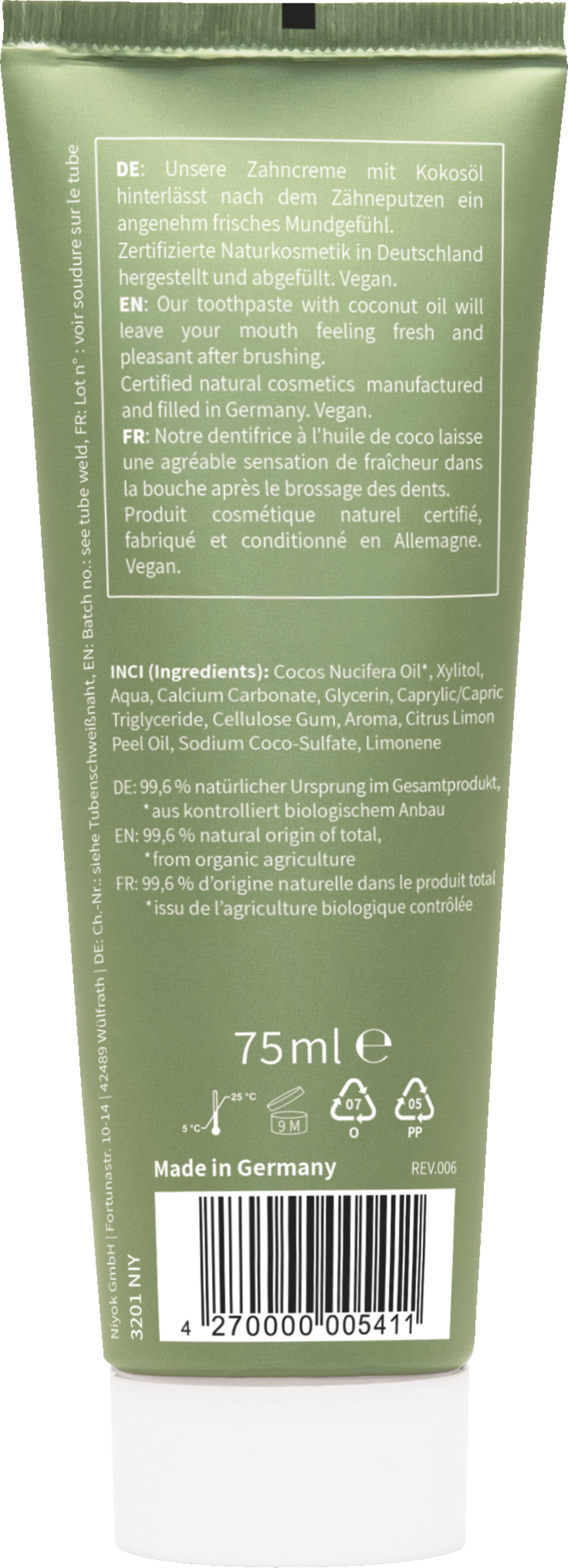Die natürliche Zahncreme aus Kokosöl von Niyok schützt Zähne und Zahnfleisch. Hochkonzentriertes Bio-Kokosöl beugt Entzündungen vor und wirkt antibakteriell. Milde Putzkörper aus Calciumcarbonat reinigen die Zahnoberflächen gründlich und wirken remineralisierend (ohne Fluorid). Xylit komplettiert den Wirkstoffkomplex, indem es Kariesbakterien an der Reproduktion hindert. Verpackt in einer plastikreduzierten Kreide-Tube. Die Zahncreme schmeckt nach erfrischender Minze gepaart mit einem leichten Hauch spritziger Zitrone.