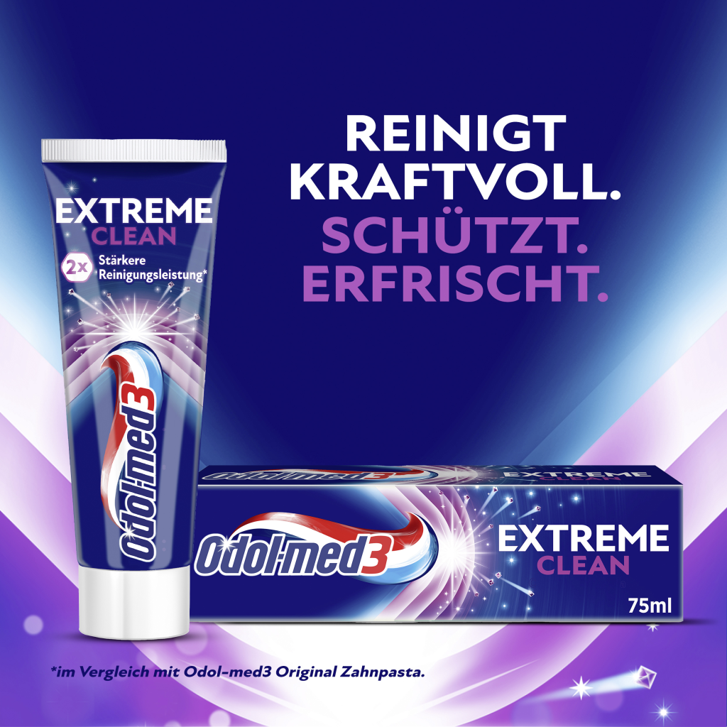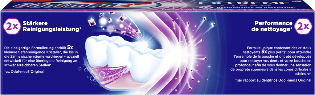 Die einzigartige Formulierung der Odol-med3 Extreme Clean Zahnpasta enthält 5x kleinere tiefenreinigende Kristalle*, die bis in die Zahnzwischenräume vordringen – speziell entwickelt für eine überlegene Reinigung an schwer erreichbaren Stellen*. Während des Zähneputzens wird Plaque bekämpft**, für ein langanhaltendes Frische-Gefühl. Das enthaltene Flourid stärkt den Zahnschmelz.
