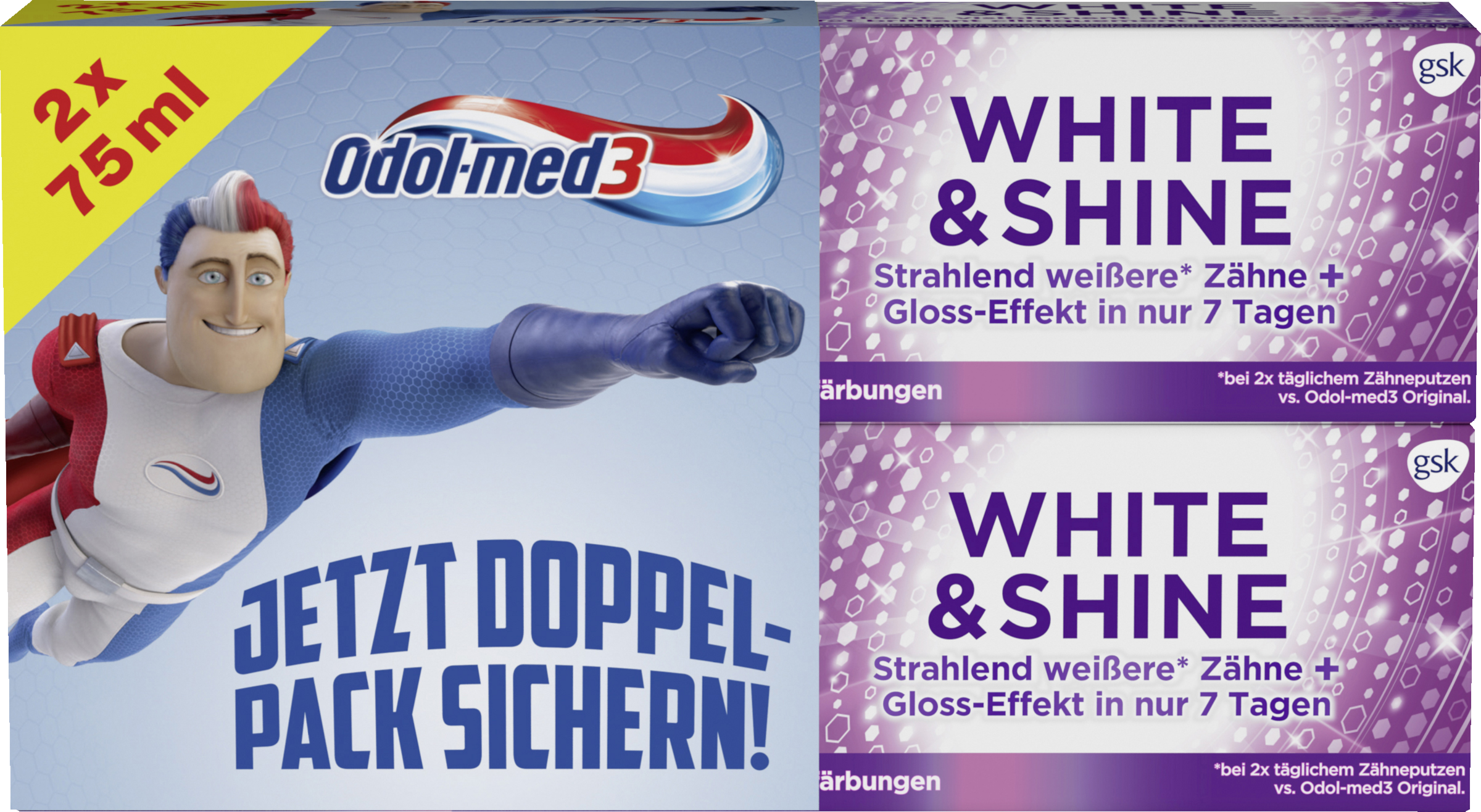 Die klinisch getestete Odol-med3 White&Shine Formel mit Micro Gloss Pearl Technologie (1) reinigt (2) glättet und (3) poliert sanft die Zahnoberfläche - für einen klinisch nachgewiesenen Gloss Effekt in nur 7 Tagen und glänzend glatte, sichtbar weißere** Zähne. Die Langzeit-Whitening-Formel bildet einen Schutzschild um den Zahn, der hilft neuen Verfärbungen vorzubeugen – für ein länger anhaltendes Zahnweiß* und ein selbstbewusstes Lächeln. Pflege deinen Mund mit der bewährten Odol-med3 3-fach Prophylaxe: gegen Karies, Zahnfleischprobleme und Zahnsteinbildung.