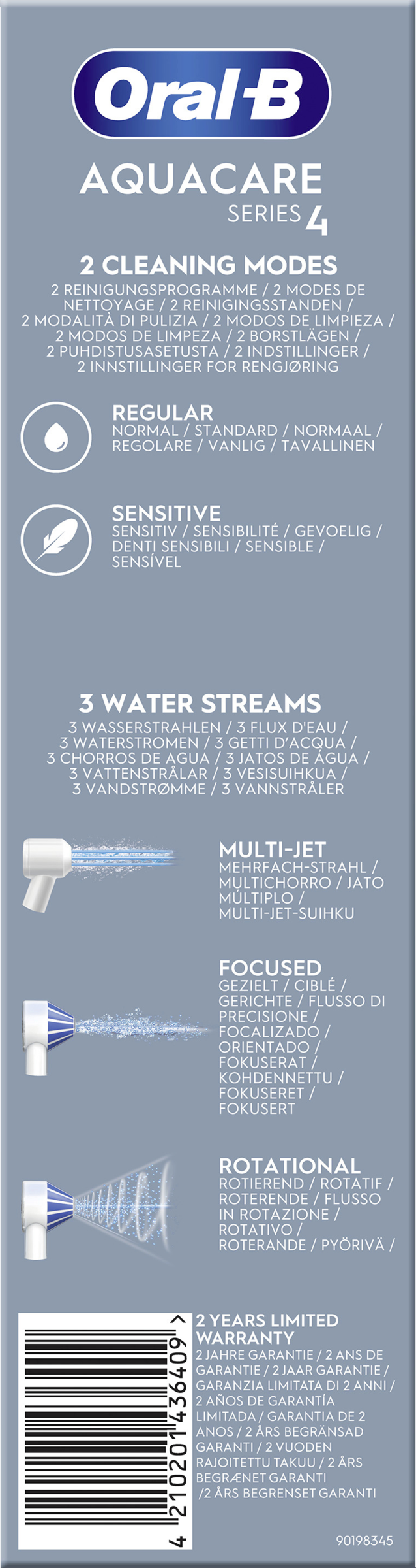 - Lieferumfang: 1 AquaCare 4 Munddusche, 1 Ladestation, 1 Oxyjet Aufsteckdüse, 1 Waterjet Aufsteckdüse