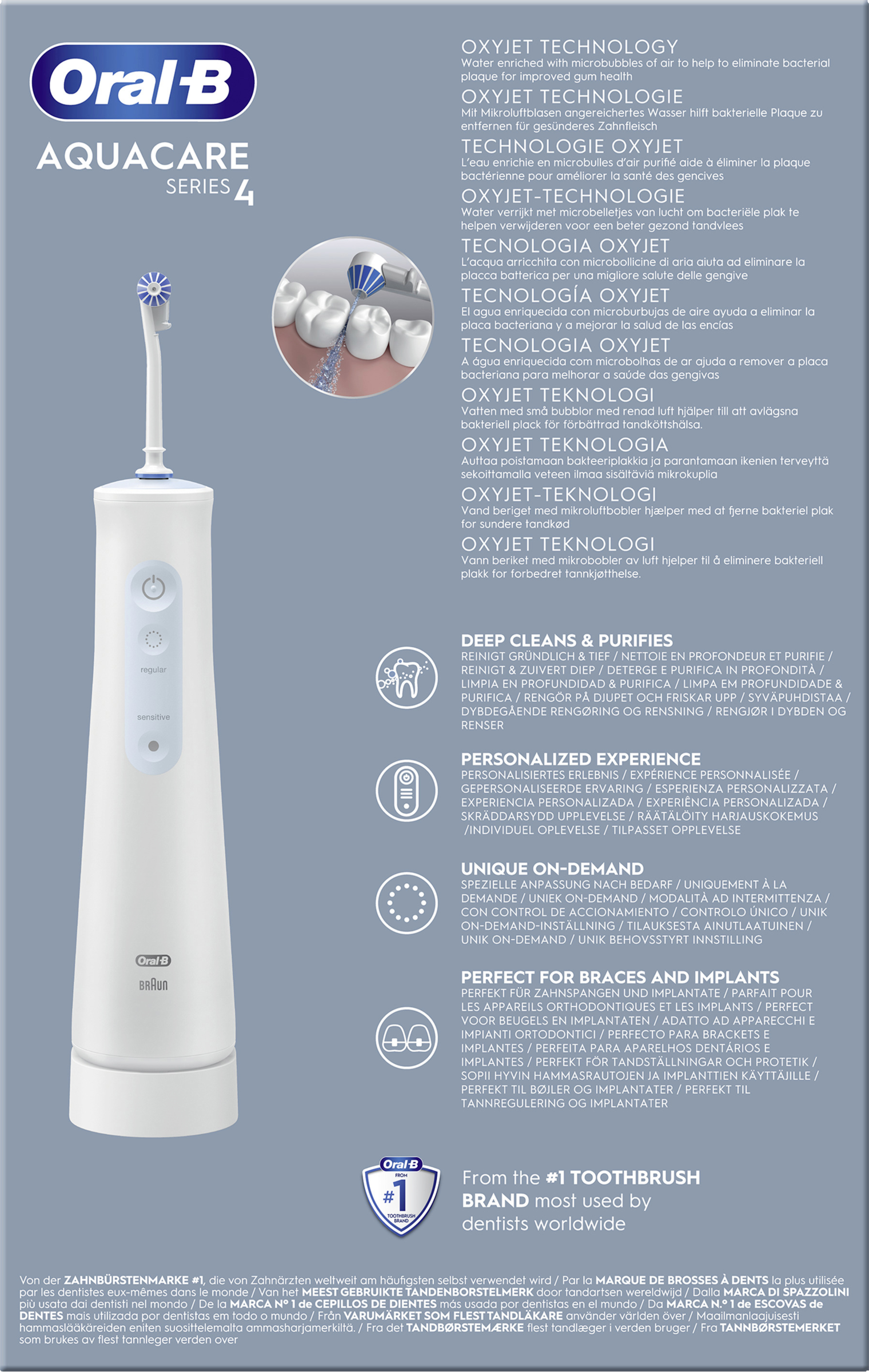 Die kabellose Munddusche Oral-B AquaCare 4 mit OxyjetTechnologie reichert Wasser mit Mikroluftblasen an und verbessert so die Gesundheit Ihres Zahnfleisches. Sie haben die Möglichkeit, den Wasserstrahl nur bei Bedarf zu aktivieren. Die Munddusche verfügt über 2 Reinigungsmodi. Sie können die Wasserintensität für eine normale oder sensitive Reinigung wählen und dabei den gezielten, den rotierenden oder den Mehrfachstrahl verwenden.