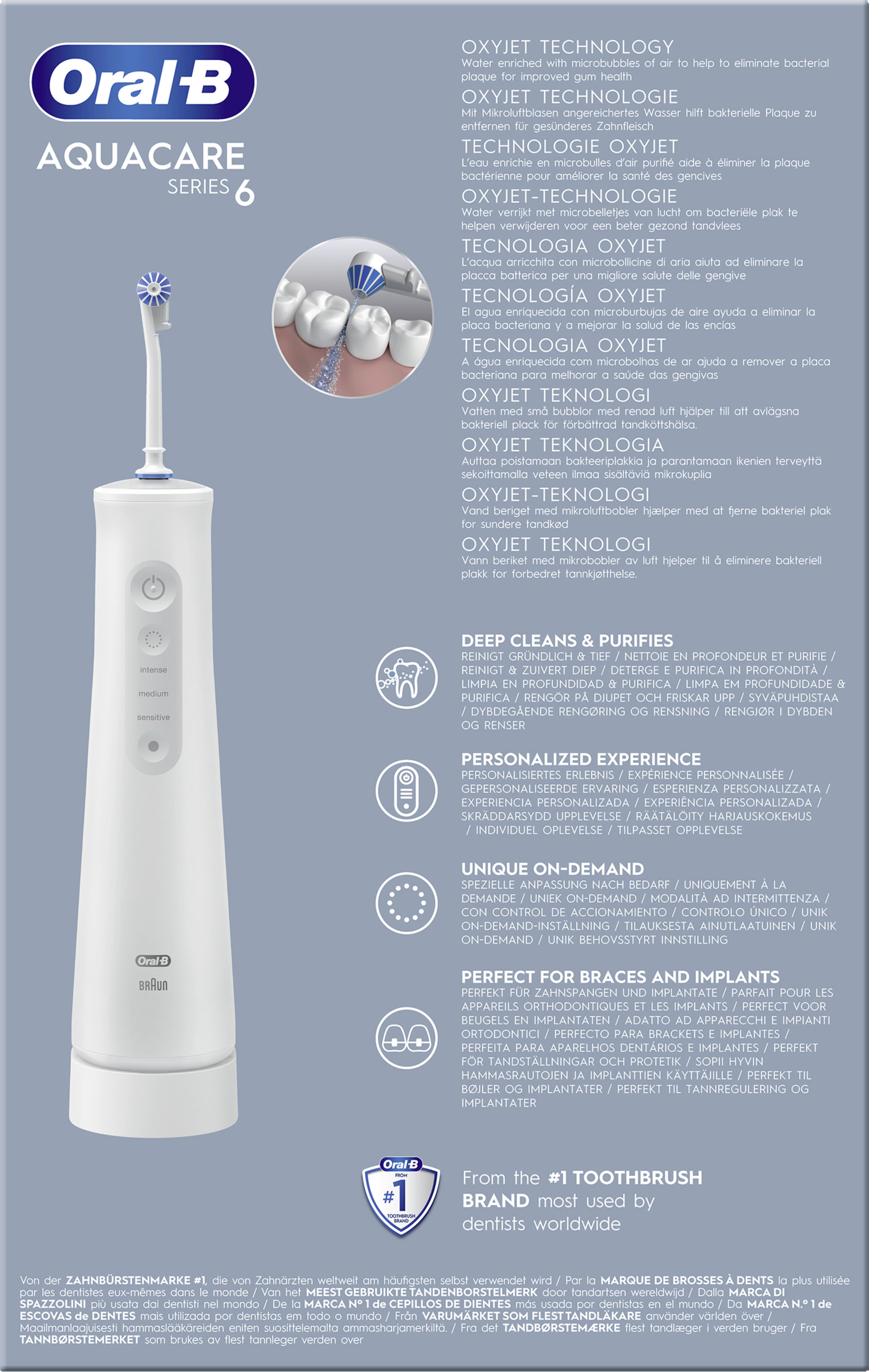 Die kabellose Munddusche Oral-B AquaCare 6 mit OxyjetTechnologie reichert Wasser mit Mikroluftblasen an und sorgt so für eine intensive Reinigung der Zahnzwischenräume und gesünderes Zahnfleisch. Sie haben die Möglichkeit, den Wasserstrahl nur bei Bedarf zu aktivieren. Die Munddusche verfügt über 3 Reinigungsmodi. Sie können die Wasserintensität für eine intensive, mittlere oder sensitive Reinigung wählen und dabei den gezielten, rotierenden oder Mehrfachstrahl verwenden.