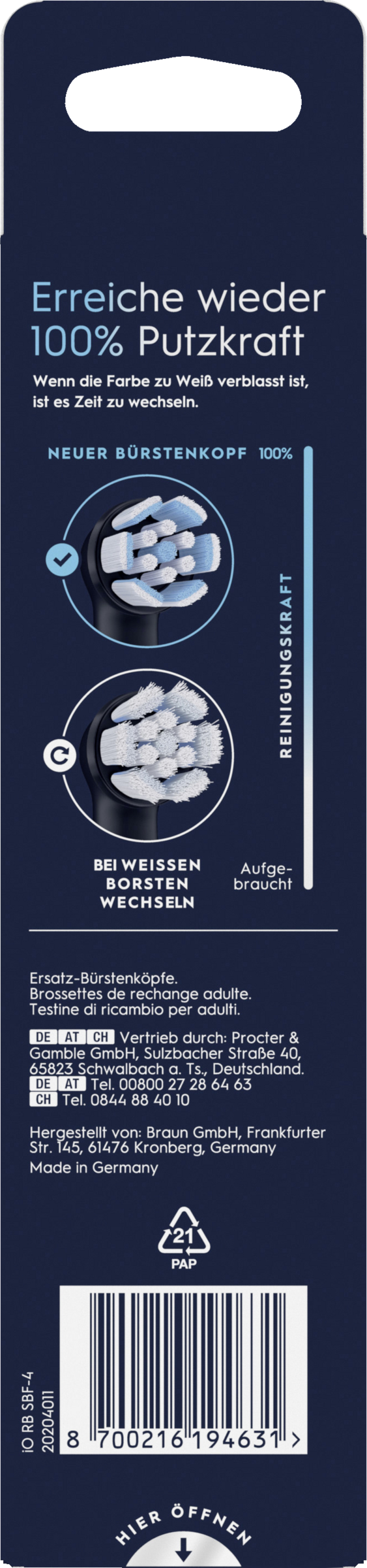 - FARBWECHSELNDE BORSTEN: Die Oral-B Aufsteckbürsten verfügen über farbwechselnde Borsten, die signalisieren, wenn der Bürstenkopf gewechselt werden sollte, für maximale Reinigungsleistung