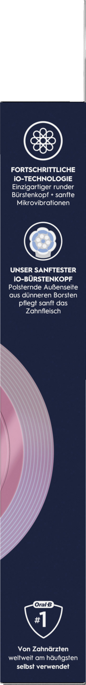Die Oral-B iO Sanfte Reinigung Aufsteckbürsten kombinieren kraftvolle, aber sanfte Mikrovibrationen mit unserem einzigartigen, von ZahnärztInnen inspirierten runden Bürstenkopf, für ein professionelles Reinigungsgefühl jeden Tag. Exklusiv für Oral-B iO elektrische Zahnbürsten entwickelt, helfen die Sanfte Reinigung Bürstenköpfe, bis zu 100% mehr Plaque als eine herkömmliche Handzahnbürste zu entfernen und lassen die Zähne sauber und hell erscheinen. Der Sanfte Reinigung Bürstenkopf hat 4000 weiche Borsten und einen polsternden Außenring, um sich genau an die Wölbung der Zähne anzupassen und das Zahnfleisch zu schützen. Da ZahnärztInnen empfehlen, für beste Ergebnisse, den Bürstenkopf alle 3 Monate zu wechseln, verfügen Oral-B Aufsteckbürsten über farbwechselnde Borsten, die signalisieren, wenn es Zeit für einen Wechsel ist. Überlegene Reinigungskraft mit den einzigen Aufsteckbürsten, die exklusiv - und garantiert passend - für die Oral-B iO elektrische Zahnbürste entwickelt wurden.