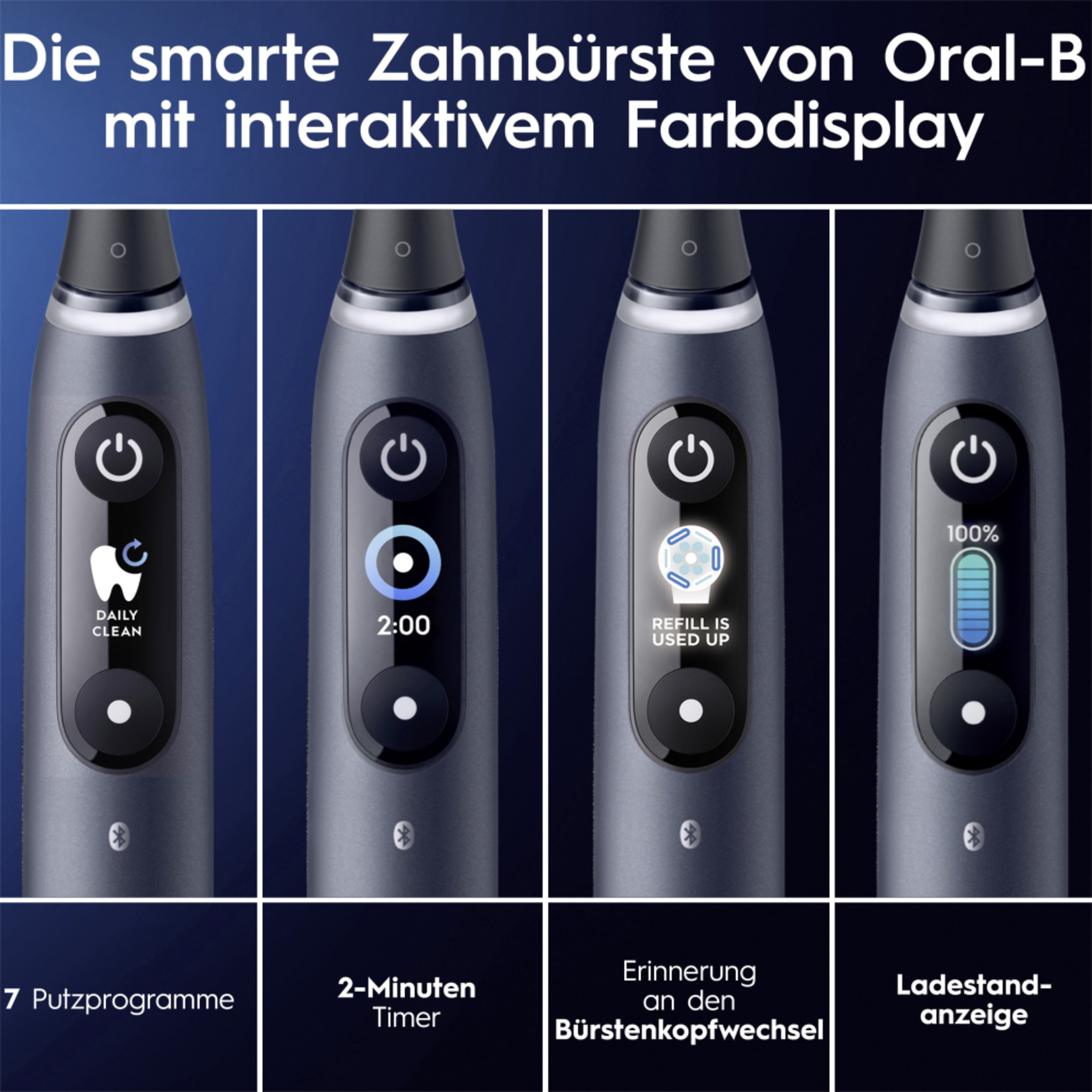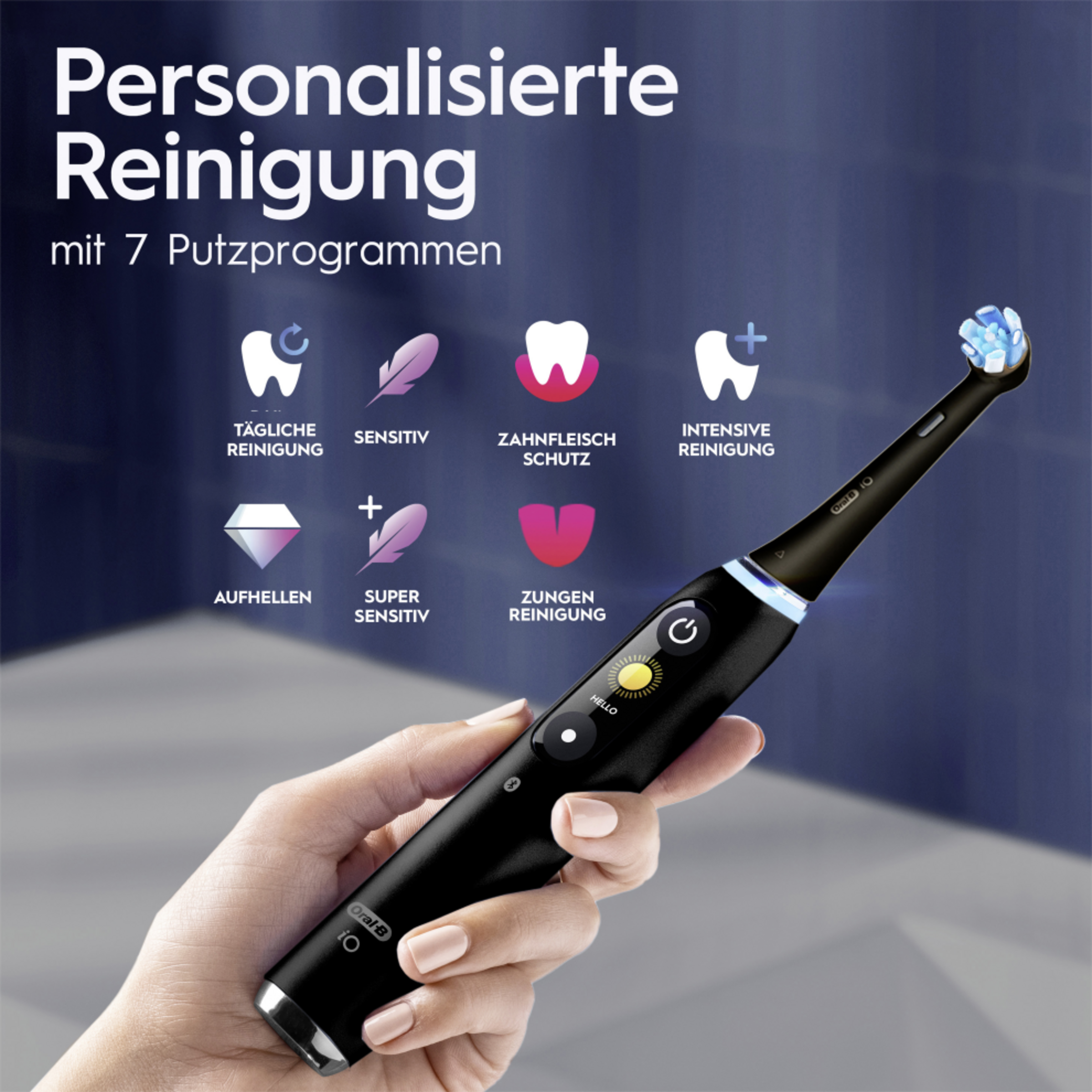 - 7 Putzprogramme für ein persönliches Putzerlebnis: Tägliche Reinigung, Sensitiv, Zahnfleischschutz, Intensive Reinigung, Aufhellen, Super Sensitiv, Zungenreinigung