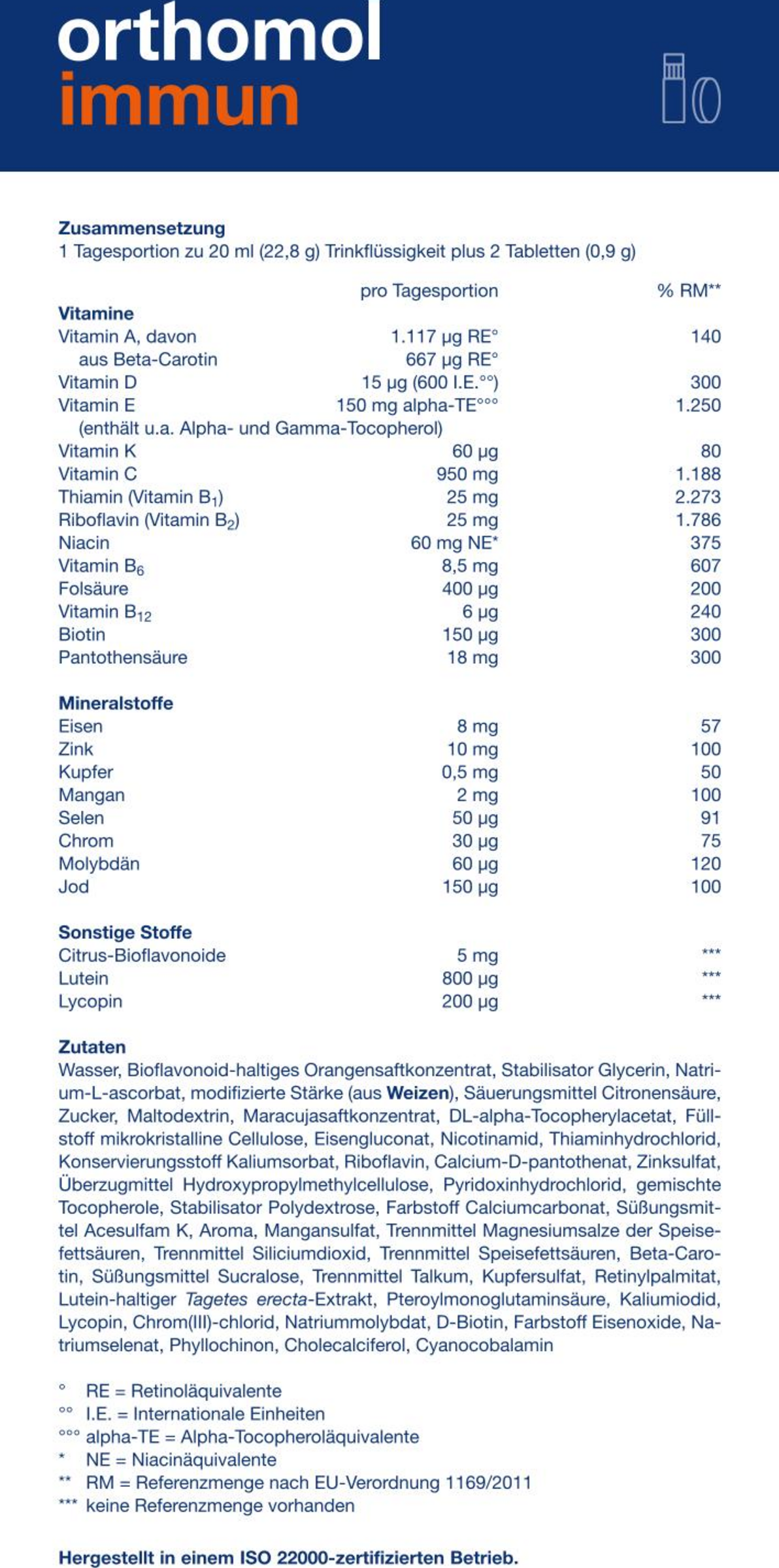 ¹Orthomol Immun mit Vitamin C, Vitamin D und Zink als Beitrag zu einer normalen Funktion des Immunsystems.