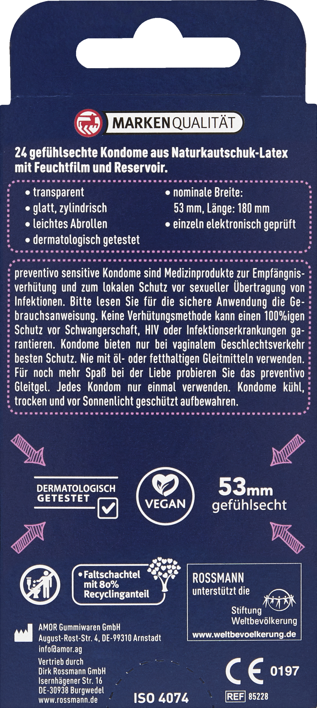 preventivo sensitive Kondome sind Medizinprodukte zur Empfängnisverhütung und zum lokalen Schutz vor sexueller Übertragung von Infektionen. Keine Verhütungsmethode kann einen hundertprozentigen Schutz vor Schwangerschaft, HIV oder Infektionserkrankungen garantieren. Kondome bieten nur bei vaginalem Geschlechtsverkehr besten Schutz. Nie mit Öl oder fetthaltigen Gleitmitteln verwenden. Jedes Kondom nur einmal verwenden.