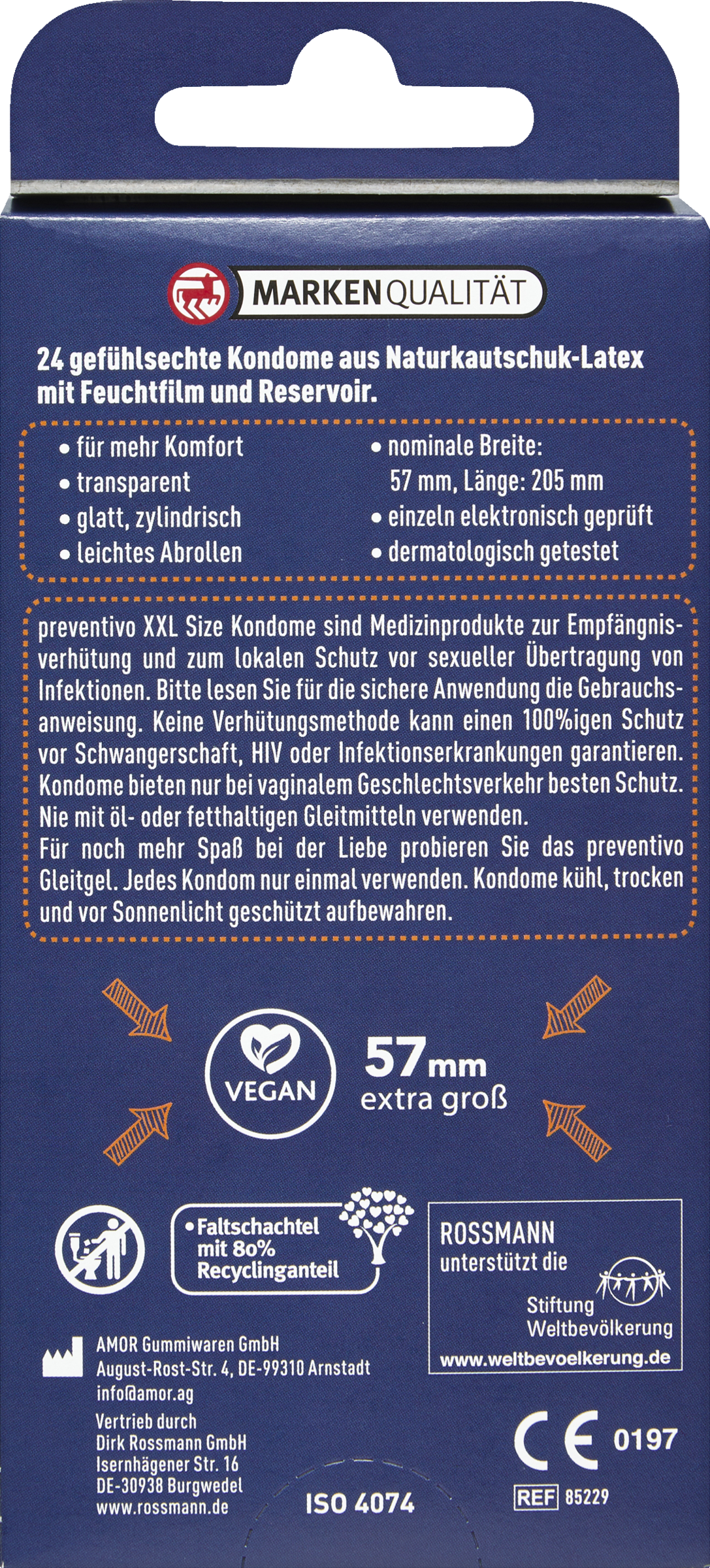 preventivo XXL Size Kondome sind Medizinprodukte zur Empfängnisverhütung und zum lokalen Schutz vor sexueller Übertragung von Infektionen. Keine Verhütungsmethode kann einen hundertprozentigen Schutz vor Schwangerschaft, HIV oder Infektionserkrankungen garantieren. Kondome bieten nur bei vaginalem Geschlechtsverkehr besten Schutz. Nie mit Öl oder fetthaltigen Gleitmitteln verwenden. Jedes Kondom nur einmal verwenden.