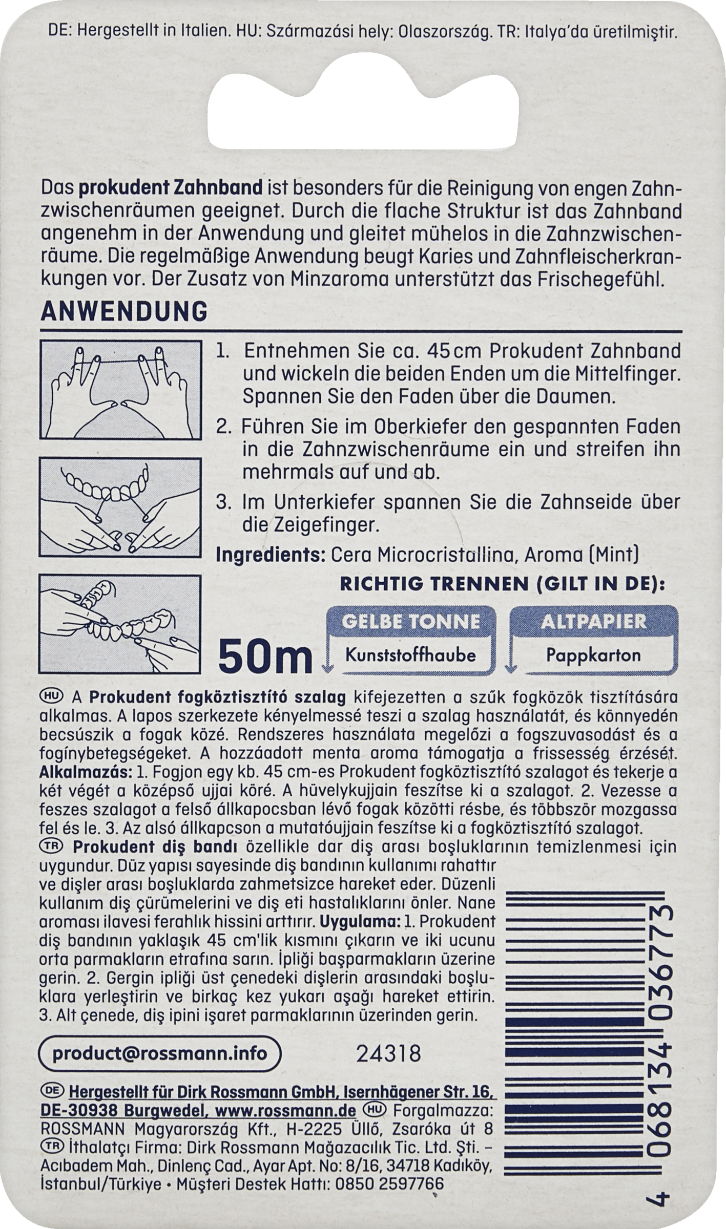 Das prokudent Zahnband ist besonders für die Reinigung von engen Zahnzwischenräumen geeignet. Durch die flache Struktur ist das Zahnband angenehm in der Anwendung und gleitet mühelos in die Zahnzwischenräume. Die regelmäßige Anwendung beugt Karies und Zahnfleischerkrankungen vor. Der Zusatz von Minzaroma unterstützt das Frischegefühl.