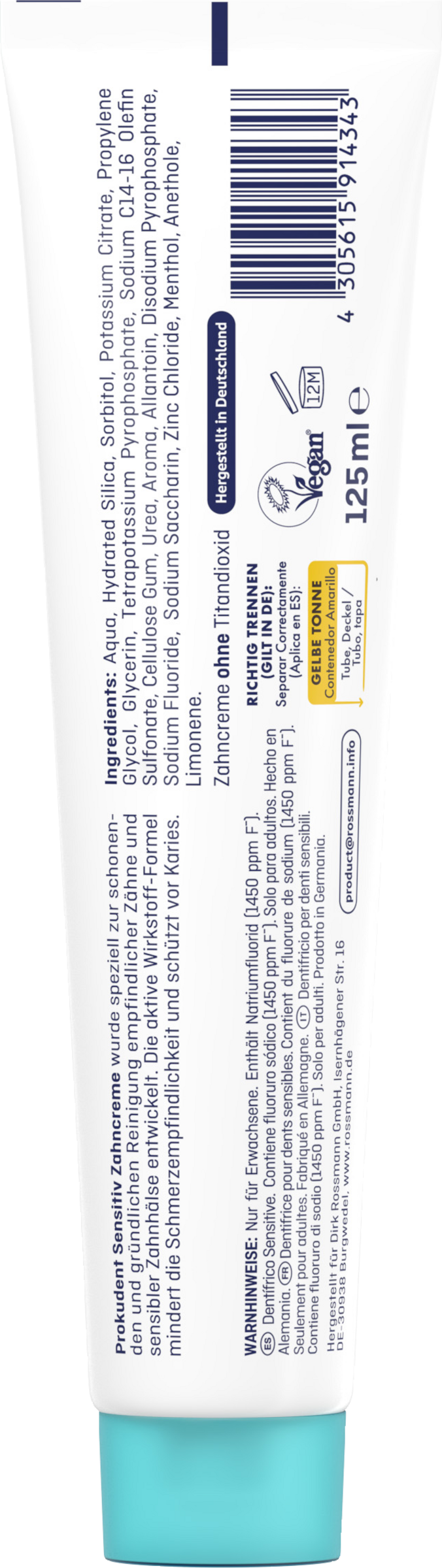 Aqua, Hydrated Silica, Sorbitol, Potassium Citrate, Propylene Glycol, Glycerin, Tetrapotassium Pyrophosphate, Sodium C14-16 Olefin Sulfonate, Cellulose Gum, Urea, Aroma, Allantoin, Disodium Pyrophosphate, Sodium Fluoride, Limonene, Sodium Saccharin, Zinc Chloride. Enthält Natriumfluorid (1.450 ppm F).