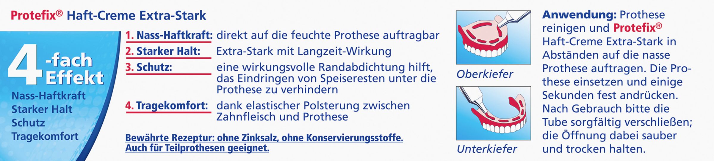 Prothese reinigen und Protefix® Haft-Creme Extra Stark Aloe Vera in Abständen dünn auf die nasse Prothese auftragen. Die Prothese einsetzen und einige Sekunden fest andrücken. Nach Gebrauch bitte die Tube sorgfältig verschließen; die Öffnung dabei sauber und trocken halten.