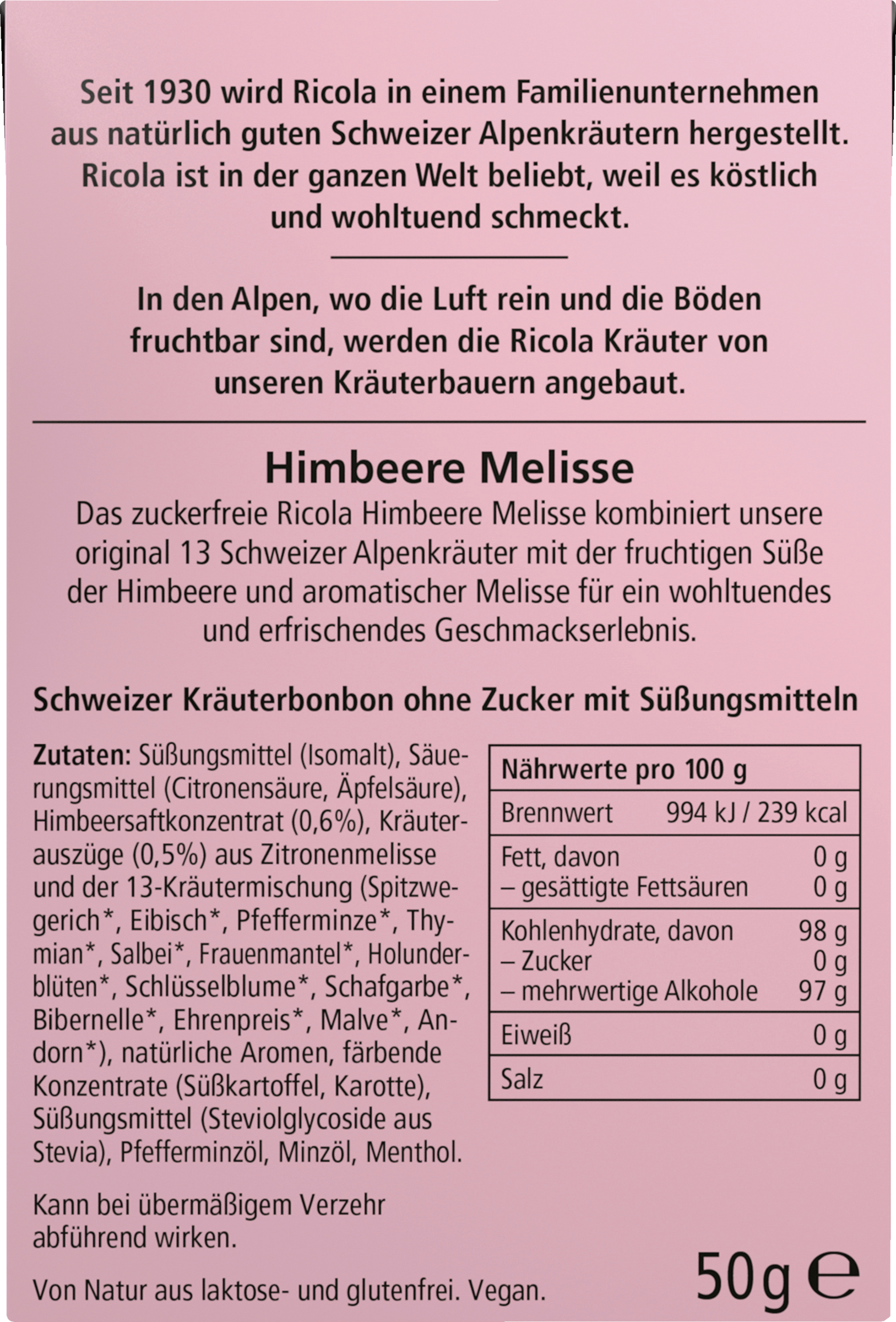 Im zuckerfreien Himbeere Melisse-Bonbon kombinieren wir unsere original 13 Schweizer Alpenkräutern mit der fruchtige Süße von reifen Himbeeren und der aromatischen Frische der Melisse zu einem wohltuenden erfrischend-fruchtigen Geschmack. Wie bei allen Produkten von Ricola werden die 13 Schweizer Alpenkräuter nach naturgemäßen Grundsätzen, ohne den Einsatz von chemischen Pflanzenschutzmitteln, in den Alpen von den Ricola Kräuterbauern angebaut. Zunächst geprägt von einem süß-fruchtigen Geschmack nach Himbeere entfaltet sich zunehmend die angenehme Frische der Melisse. Beides zusammen ergibt so ein wohltuendes und erfrischendes Geschmackserlebnis. Ricola Himbeere Melisse – Wohltuend und erfrischender Genuss. Wir wünschen Dir viele kleine, erfrischende Wohlfühlmomente! Jedes Ricola Hustenbonbon ist ein einfacher, ehrlicher Wunsch von uns an Dich: Wir wünschen Dir "Alles Gute." Probier's, weil's schmeckt! • Fruchtig – Fruchtige Himbeere, aromatische Melisse und 13 natürliche Schweizer Alpenräuter. Wohltuend und erfrischender Genuss. • Lecker - Durch die fein aufeinander abgestimmten Zutaten punkten die Bonbons in Geschmack und Qualität. • Zuckerfrei - schont die Zähne, natürlich gesüßt mit Steviolglycosiden aus der Stevia-Pflanze. • Praktisch - Die gewickelten Bonbons im Beutel sind ideal für wohltuende und vitalisierende Momente zu Hause, Unterwegs und zum Teilen. • Premiumqualität - Grundlage aller Unternehmensentscheidungen ist Ricolas kompromissloser Qualitätsanspruch. • Natürlich nachhaltig - Seit jeher gehören nachhaltiges Denken und Handeln zu Ricola und bilden bereits seit Jahrzehnten eine wichtige Entscheidungsgrundlage für die Unternehmensführung. Hinweise: • Können bei übermäßigem Verzehr abführend wirken. • Vor Wärme und Feuchtigkeit geschützt aufbewahren. • Lactosefrei, Glutenfrei, Vegan.