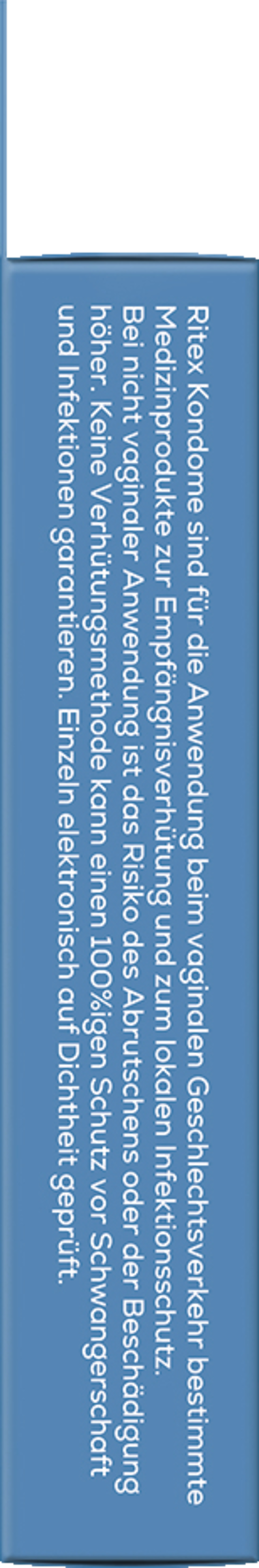 Ritex Kondome sind für die Anwendung beim vaginalen Geschlechtsverkehr bestimmte Medizinprodukte zur Empfängnisverhütung und zum lokalen Infektionsschutz. Bei nicht vaginaler Anwendung ist das Risiko des Abrutschens oder der Beschädigung höher. Keine Verhütungsmethode kann einen 100%igen Schutz vor Schwangerschaft und Infektionen garantieren.