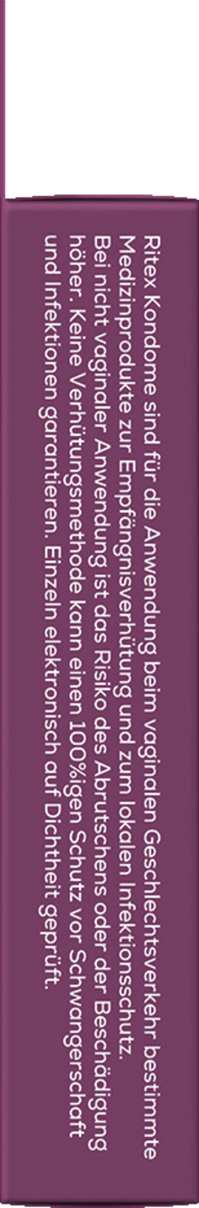 Ritex Kondome sind für die Anwendung beim vaginalen Geschlechtsverkehr bestimmte Medizinprodukte zur Empfängnisverhütung und zum lokalen Infektionsschutz. Bei nicht vaginaler Anwendung ist das Risiko des Abrutschens oder der Beschädigung höher. Keine Verhütungsmethode kann einen 100%igen Schutz vor Schwangerschaft und Infektionen garantieren.