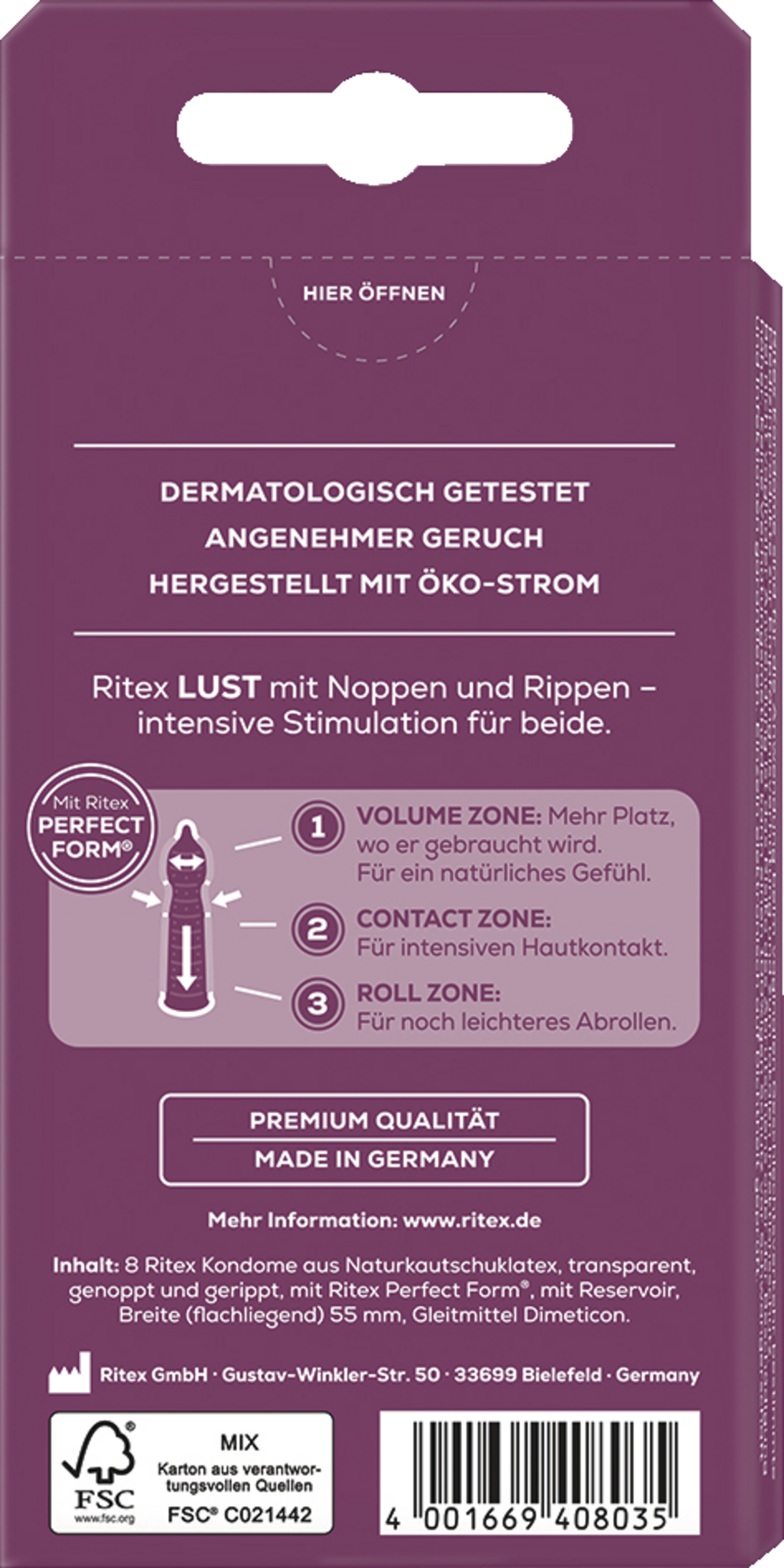 Ritex LUST Kondome stimulieren mit ihrer speziellen Noppen- und Rippenstruktur beide Partner. Sie genießt die ausgeprägten weichen Noppen und Rippen. Er erlebt besonders intensive Gefühle durch die spezielle Ritex Perfect Form®.