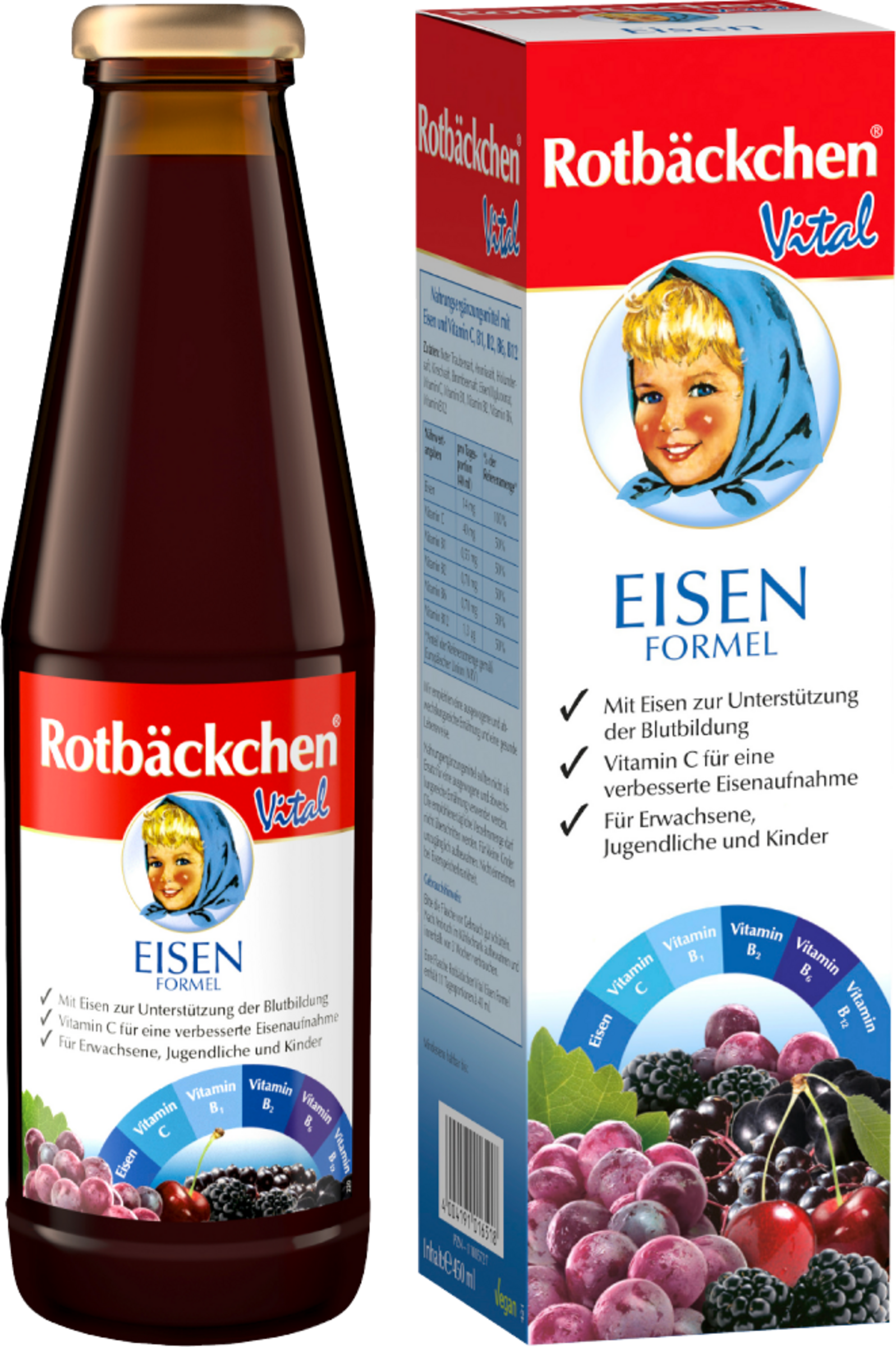 Roter Traubensaft, Aroniasaft, Holundersaft, Kirschsaft, Brombeersaft, Eisen(II)gluconat, Vitamin C, Vitamin B12, Vitamin B6, Vitamin B2, Vitamin B1.