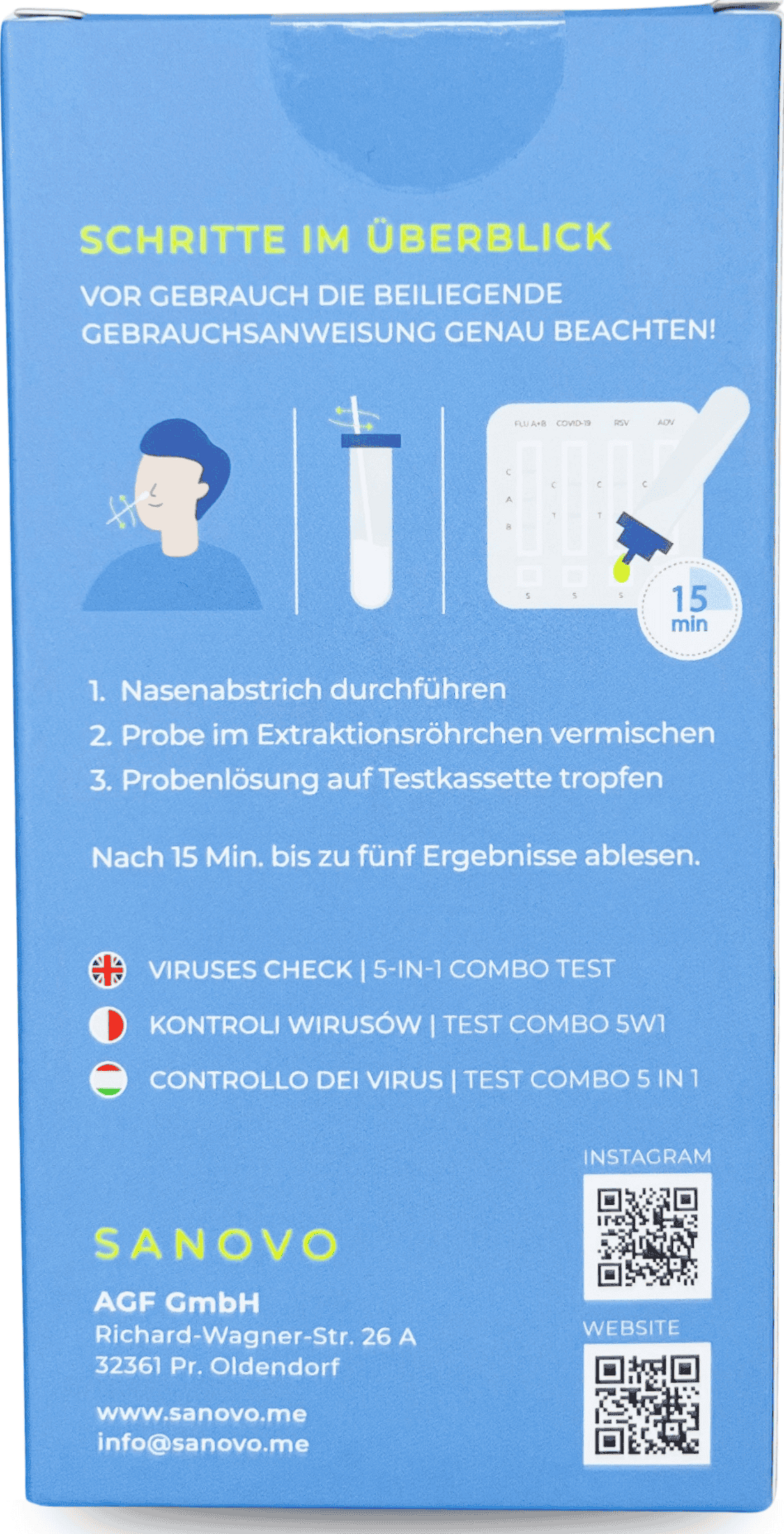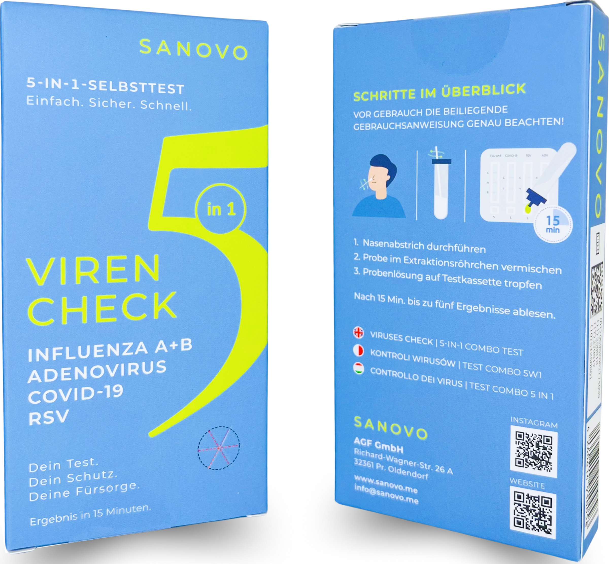 Der SANOVO Viren Check COMBO 5-in-1 Antigen-Schnelltest ist eine Innovation im Bereich der Selbstdiagnostik. Mit nur einem Nasenabstrich erkennt dieser Test gleichzeitig fünf der häufigsten Atemwegserreger von grippeähnlichen Symptomen: