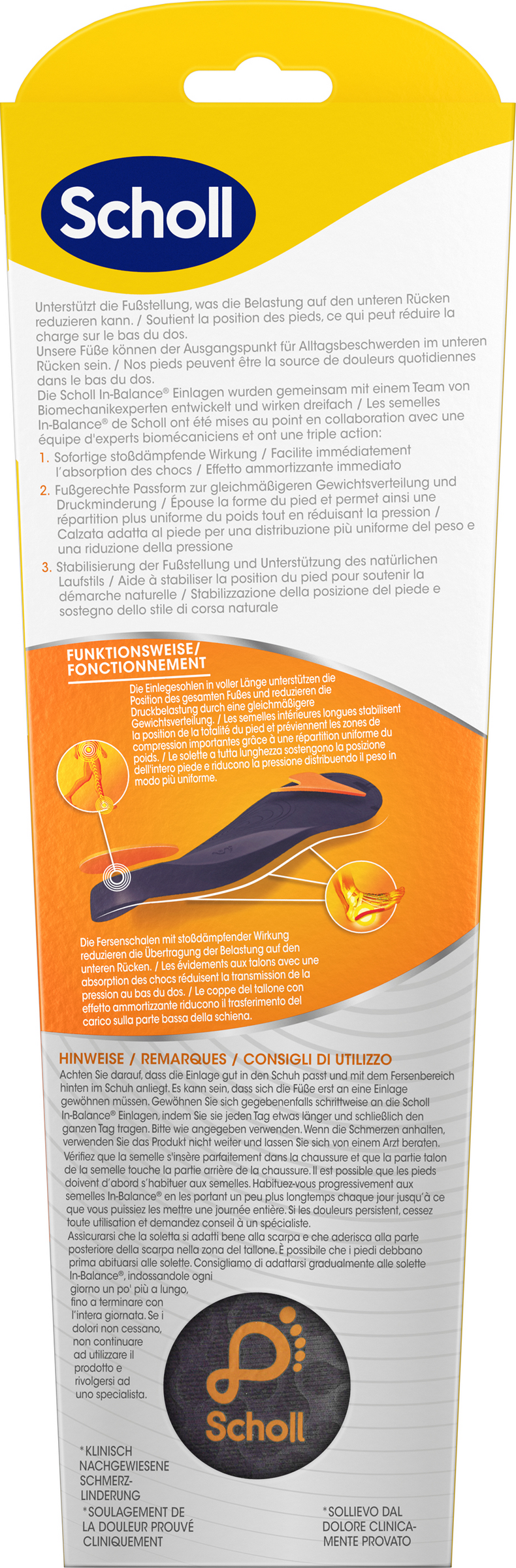 Unsere Füße können der Ausgangspunkt für Alltagsbeschwerden im unteren Rücken sein. Die Scholl In-Balance Einlagen wurden gemeinsam mit einem Team von Biomechanikexperten entwickelt und wirken dreifach: