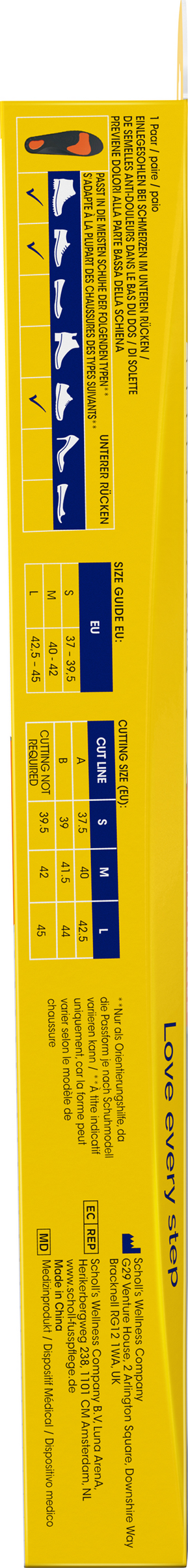 Achten Sie vor Verwendung darauf, dass das Produkt gut in den Schuh passt. Nehmen Sie gegebenfalls die vorhandene Einlegesohle heraus. Die Ferse der Einlegesohle sollte am hinteren Ende des Schuhs anliegen. Wenn nötig, schneiden Sie den Rand entlang der aufgedruckten Linien auf die gewünschte Größe zu. Es kann sein, dass sich die Füße erst an die Einlage gewöhnen müssen. Gewöhnen Sie sich gegebenenfalls schrittweise an die Scholl In-Balance Einlegesohlen, indem Sie sie jeden Tag etwas länger und schließlich den ganzen Tag tragen. Wenn die Schmerzen anhalten, verwenden Sie das Produkt nicht weiter und lassen Sie sich von einem Arzt beraten.