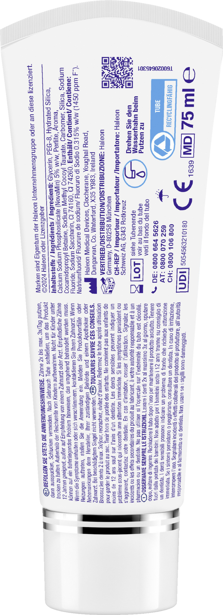 Empfindliche Zähne können auf ein tieferliegendes Problem hinweisen, das der schnellen Betreuung durch einen Zahnarzt bedarf. Kontaktieren Sie bei anhaltenden Symptomen Ihren Zahnarzt. Nicht für Kinder unter 12 Jahren geeignet, außer auf Empfehlung von einem Zahnarzt oder Arzt. Bei Unverträglichkeit absetzen.
