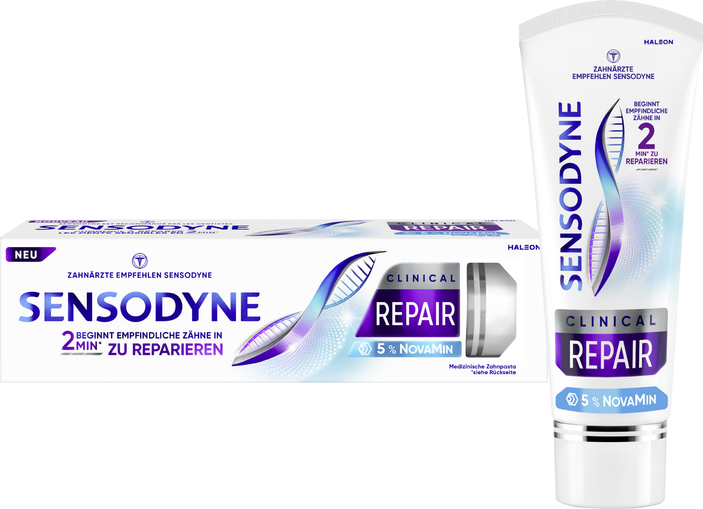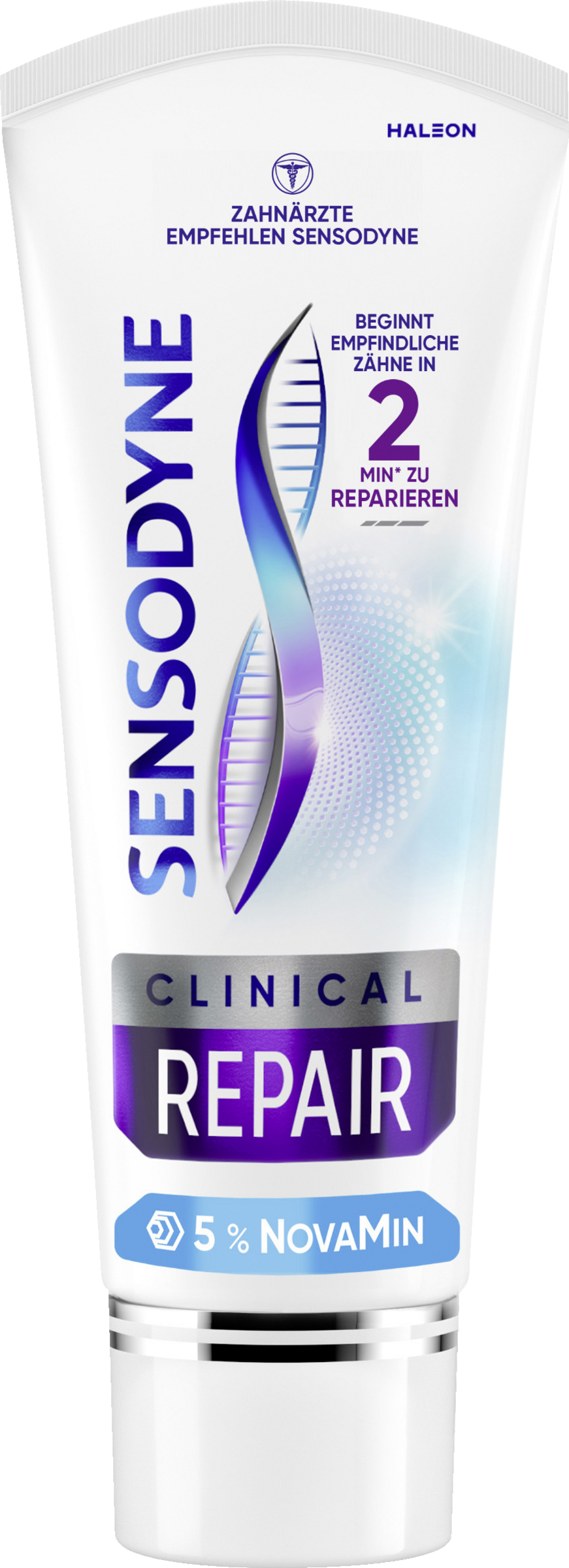 Das Bioglas NovaMin ist ein einzigartiger Inhaltsstoff, der dieselben mineralischen Bausteine enthält wie natürliche Zahnsubstanz: Kalzium und Phosphat. Durch Freisetzung dieser Mineralien baut NovaMin bei regelmäßiger Anwendung eine widerstandsfähige, zahnschmelz-ähnliche Schutzschicht über empfindlichen Zahnbereichen auf, die bis zu 76% härter ist als natürliches Dentin.* Die neue Sensodyne Clinical Repair Zahnpasta mit NovaMin beginnt bereits ab der ersten Anwendung eine reparierende Schicht über und innerhalb der freiliegenden Dentinkanälchen schmerzempfindlicher Zähne zu bilden.