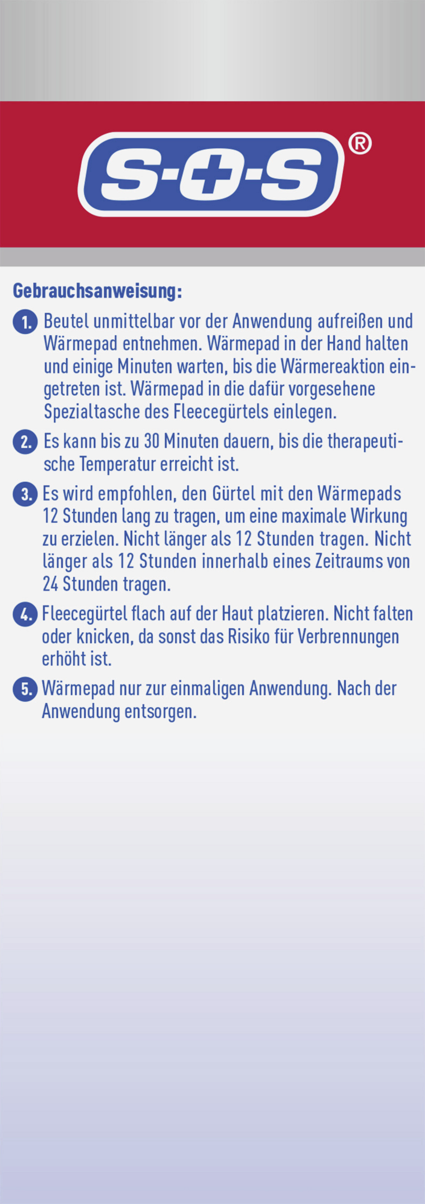 Dieses Produkt kann Verbrennungen verursachen. Außerhalb der Reichweite von Kindern, Kleinkindern und Tieren aufbewahren. Nicht in der Mikrowelle erwärmen. Dieses Produkt ist zur einmaligen Anwendung. Dieses Produkt kann bei empfindlicher Haut oder unsachgemäßer Anwendung Juckreiz, Rötungen oder leichte Verbrennungen der Haut verursachen. Nicht während des Schlafs verwenden. Haut während der Anwendung häufig kontrollieren. Fragen Sie vor der Anwendung einen Arzt um Rat, wenn Sie Diabetes, Durchblutungsstörungen oder eine Herzerkrankung haben, an rheumatoider Arthritis leiden oder schwanger sind. Bei Auftreten einer Hautreizung oder Verbrennung das Produkt sofort entfernen. Die Wärmezellen enthalten Eisen, das bei Verschlucken gesundheitsschädlich sein kann. Bei Verschlucken den Mund mit Wasser ausspülen und unverzüglich das Giftinformationszentrum kontaktieren. Bei Kontakt von Haut oder Augen mit dem Inhalt der Wärmekompresse den betroffenen Bereich sofort mit Wasser spülen. Das Produkt nicht in der Mikrowelle erwärmen oder versuchen, dieses erneut zu erwärmen, da die Wärmekompresse sich entzünden könnte. Ent‑ sorgen Sie Abfälle gemäß den geltenden örtlichen Bestimmungen.