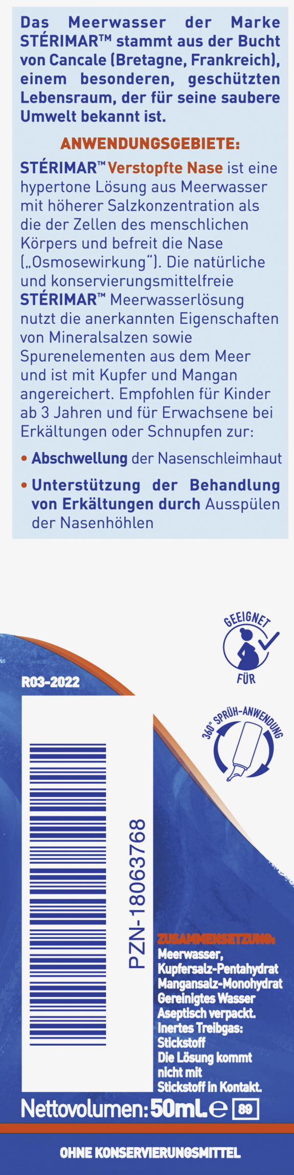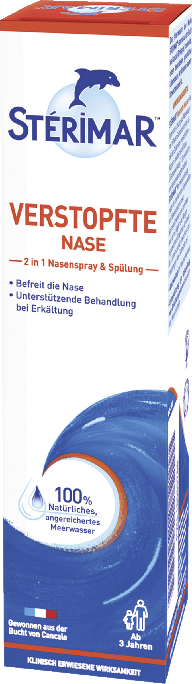 Sterimar Verstopfte Nase ist eine hypertone Lösung aus Meerwasser mit höherer Salzkonzentration als die Zellen des menschlichen Körpers und befreit die Nase ("Osmosewirkung"). Die natürliche und konservierungsmittelfreie Sterimar Meerwasserlösung nutzt die anerkannten Eigenschaften von Mineralsalzen sowie Spurenelementen aus dem Meer und ist mit Kupfer und Mangan angereichert. Empfohlen für Kinder ab 3 Jahren und für Erwachsene bei Erkältungen oder Schnupfen zur Abschwellung der Nasenschleimhaut und zur Unterstützung der Behandlung von Erkältungen durch Ausspülen der Nasenhöhlen.