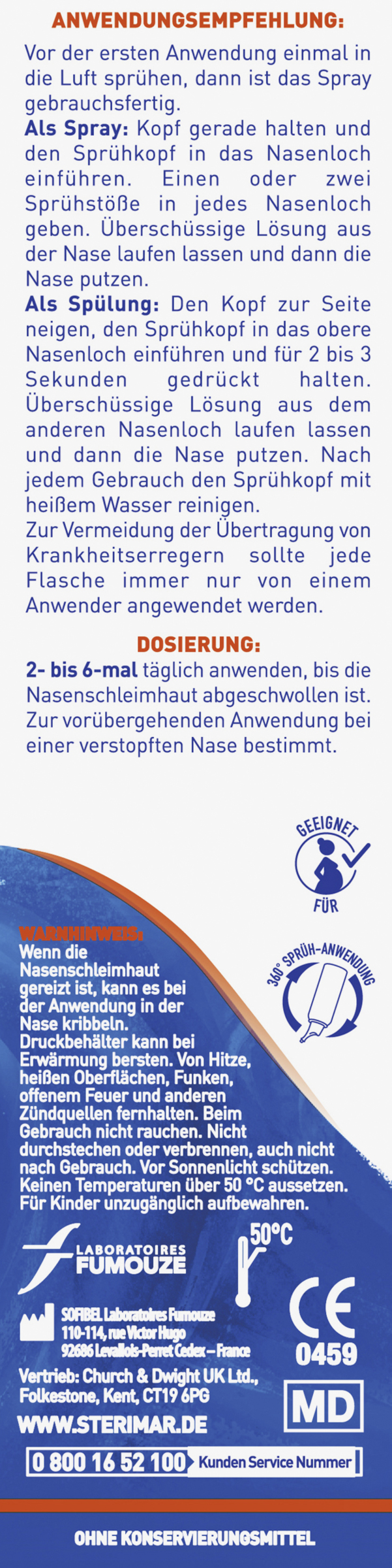 Vor der ersten Anwendung einmal in die Luft sprühen, dann ist das Spray gebrauchsfertig. Als Spray: Kopf gerade halten und den Sprühkopf in das Nasenloch einführen. Einen oder zwei Sprühstöße in jedes Nasenloch geben. Überschüssige Lösung aus der Nase laufen lassen und dann die Nase putzen. Als Spülung: Den Kopf zur Seite neigen, den Sprühkopf in das obere Nasenloch einführen und für 2 bis 3 Sekunden gedrückt halten. Überschüssige Lösung aus dem anderen Nasenloch laufen lassen und dann die Nase putzen. Nach jedem Gebrauch den Sprühkopf mit heißem Wasser reinigen. Zur Vermeidung der Übertragung von Krankheitserregern sollte jede Flasche immer nur von einem Anwender angewendet werden.