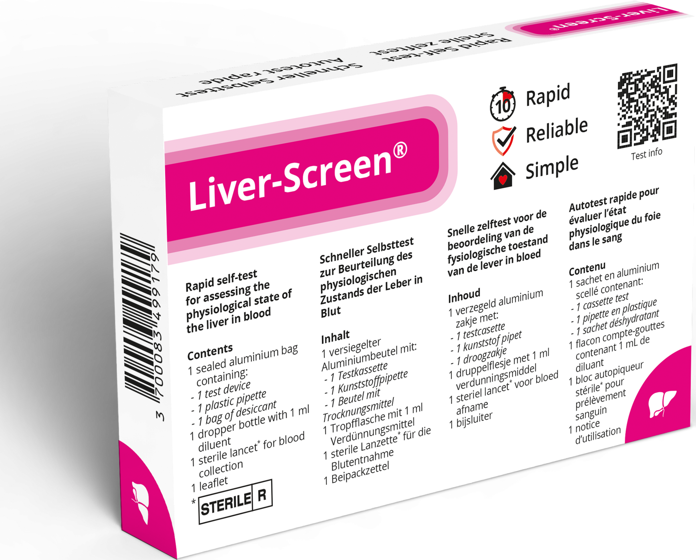 Die Leber ist ein wichtiges Organ des menschlichen Körpers und spielt eine entscheidende Rolle für die Gesundheit. Sie hilft bei der Aufnahme von Nahrung, der Entgiftung des Blutes, der Synthese von Proteinen und der Speicherung von Energie.Bei einem Leberproblem treten eine Reihe von Symptomen auf, wie z. B. die Produktion von dunklem Urin, verfärbter Stuhl, Appetitlosigkeit, Gelbfärbung des Augenweißes oder der Haut (Gelbsucht). Weitere Symptome können Schwellungen des Bauches, Schwächegefühl oder extreme Müdigkeit sein. Die Ursachen für diese Lebererkrankungen können vielfältig sein: Hepatitis, Nebenwirkungen bestimmter Medikamente, Zirrhose infolge von Alkoholmissbrauch und Übergewicht, insbesondere bei Diabetes oder Bluthochdruck.Es können mehrere diagnostische Tests zur Bestimmung der Leberfunktion durchgeführt werden, doch die am häufigsten verwendeten Tests sind die Messung der Aktivität der Transaminasen-Enzyme (ALAT und ASAT). Diese Enzyme werden von der Leber bei Funktionsstörungen oder bei der Entwicklung von Krankheiten ins Blut abgegeben.LIVER-Screen® ist ein immundiagnostischer Schnelltest zum Nachweis einer erhöhten Aktivität von Transaminasen (ALAT und ASAT) in einer Kapillarblutprobe aus der Fingerbeere.