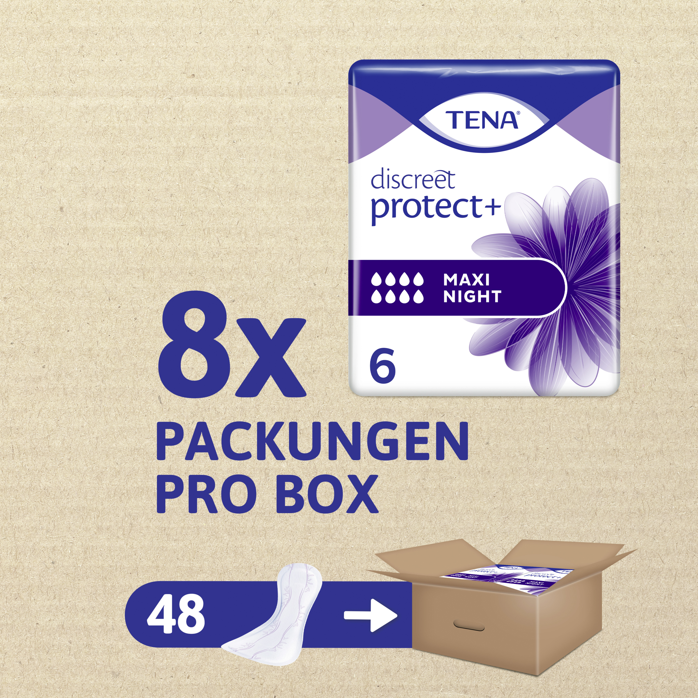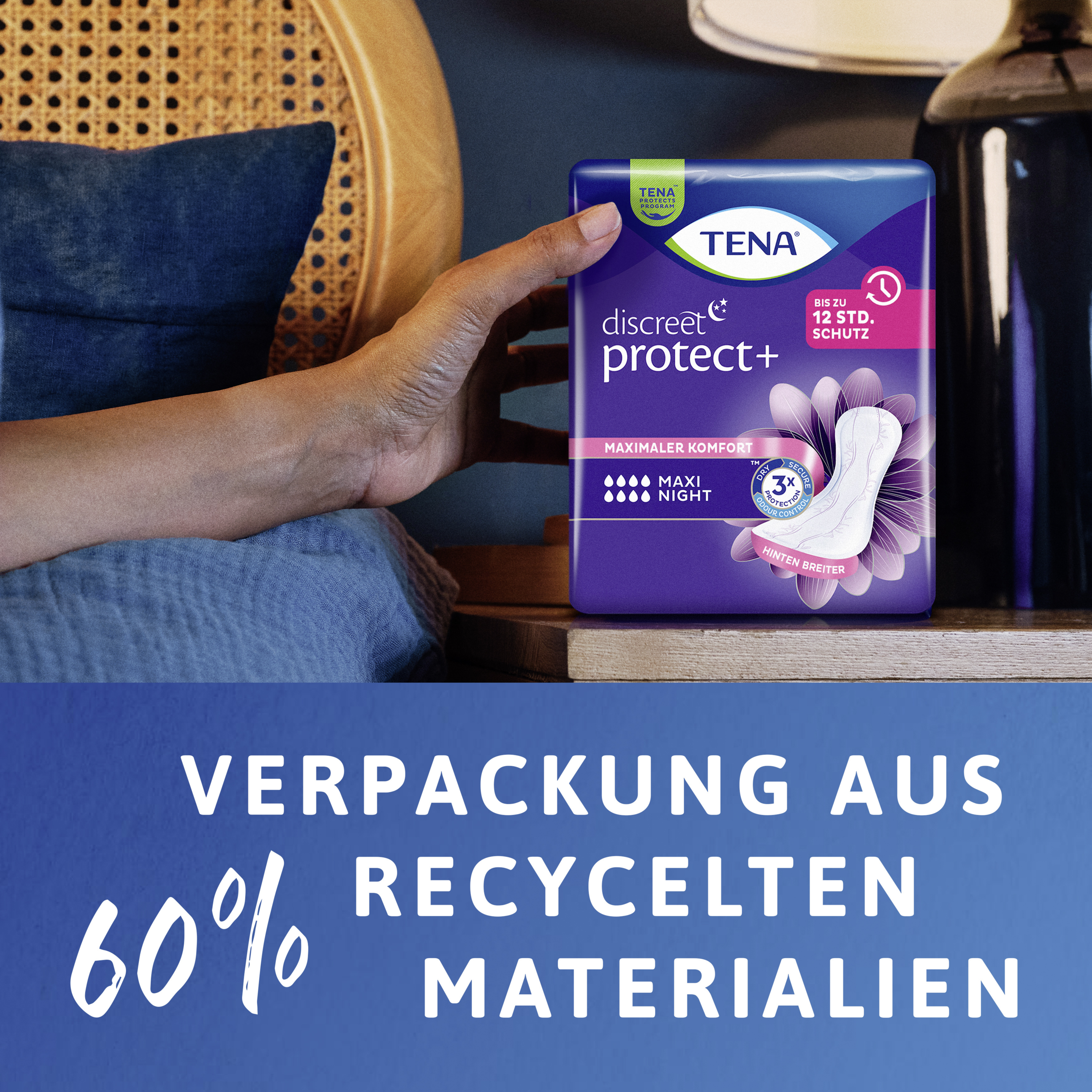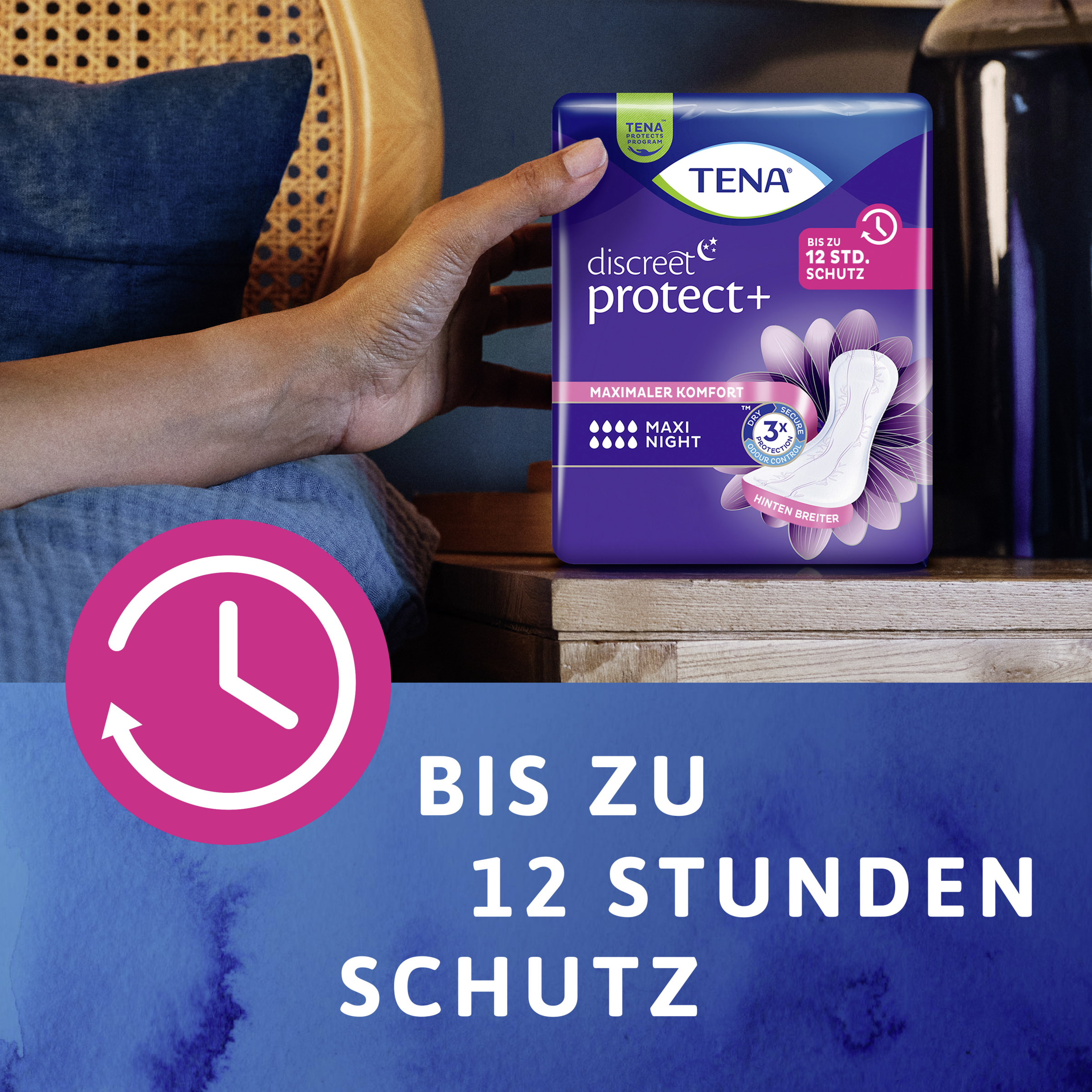 TENA Discreet Protect+ Maxi Night ist die perfekte Einlage für Frauen bei schwerer Blasenschwäche in der Nacht. Fühl dich sicher dank DREIFACHSCHUTZ vor Auslaufen, Feuchtigkeit und Gerüchen - auch im Wochenbett. Die Einlage saugt Flüssigkeit schnell auf, schließt sie tief im Innern der Einlage ein und weg von der Hautoberfläche - bis zu 12 Stunden Schutz. Fortschrittliche Mikro-Frischeperlen reduzieren gleichzeitig unerwünschte Gerüche. TENA Discreet Protect+ Maxi Night ist unsere saugstärkste Einlage und verfügt außerdem über zusätzliche Länge und Breite im hinteren Bereich für ultimativen Schutz im Liegen. Die weichen, atmungsaktiven Materialien sorgen für maximalen Komfort - damit du die ganze Nacht ungestört schlafen kannst.