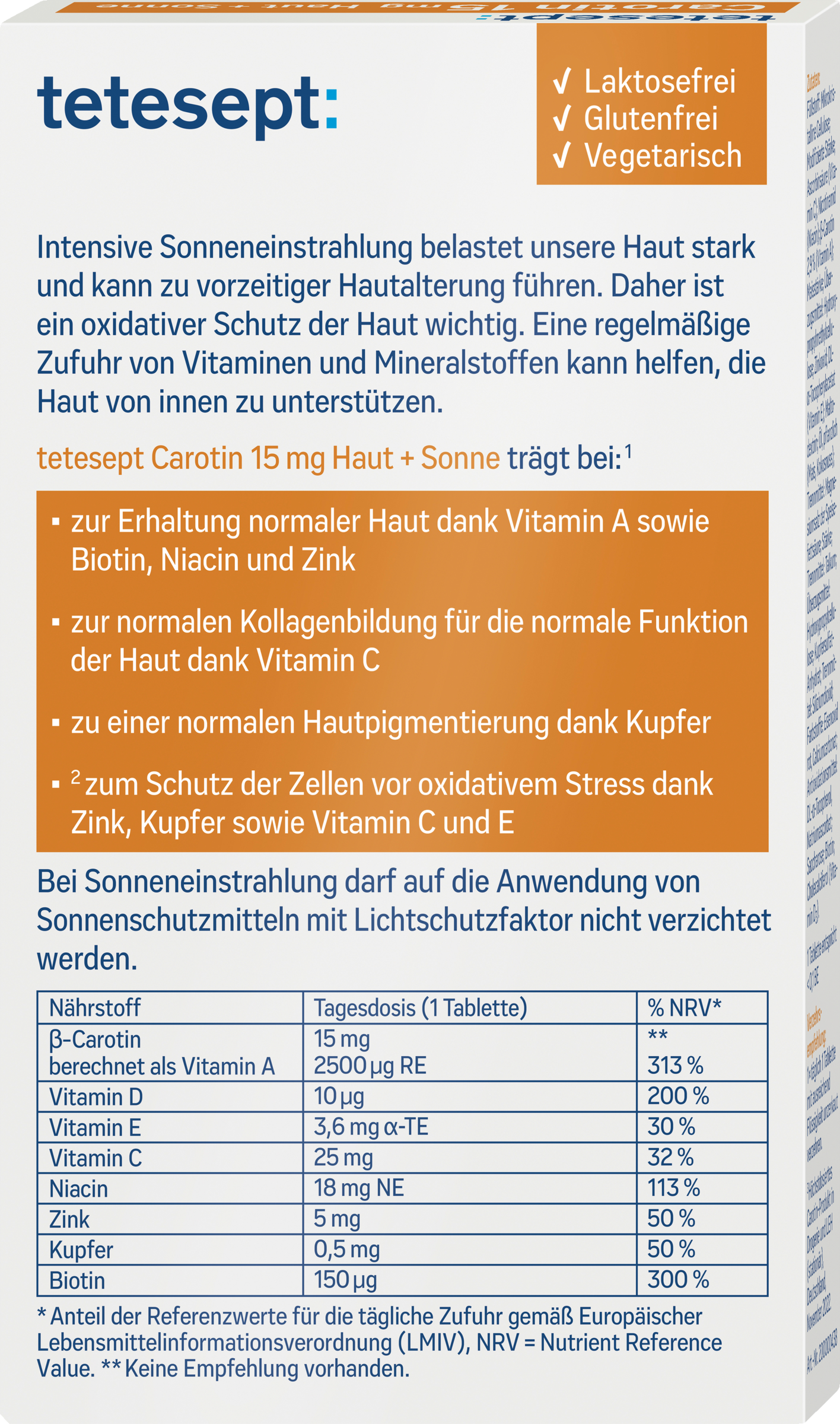 Füllstoff: Mikrokristalline Cellulose; Modifizierte Stärke; Ascorbinsäure (Vitamin C); Nicotinamid (Niacin); β-Carotin 2,9% (Vitamin A); Maisstärke; Überzugsmittel: Hydroxypropylmethylcellulose; Zinkoxid; DL-α-Tocopherylacetat (Vitamin E); Maltodextrin; Öl, pflanzlich (Mais, Kokosnuss); Trennmittel: Magnesiumsalz der Speisefettsäure; Stärke; Trennmittel: Talkum; Überzugsmittel: Hydroxypropylcellulose; Kupfersulfat-Anhydrat; Trennmittel: Siliziumdioxid; Farbstoffe: Eisenoxid rot, Calciumcarbonat; Antioxidationsmittel: DL-α-Tocopherol, Natriumascorbat; Saccharose; Biotin; Cholecalciferol (Vitamin D3).