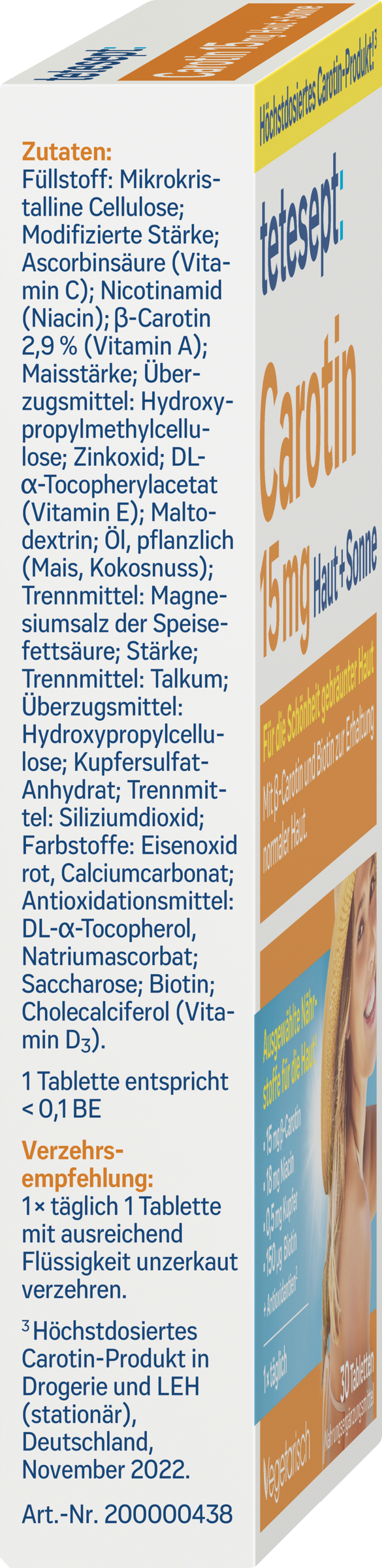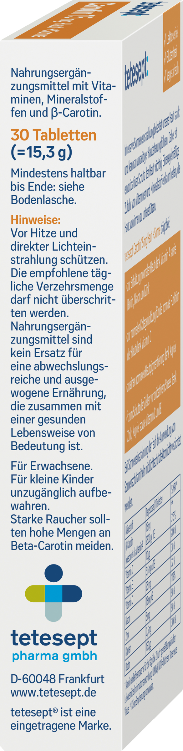 Die empfohlene tägliche Verzehrsmenge darf nicht überschritten werden. Nahrungsergänzungsmittel sind kein Ersatz für eine abwechslungsreiche und ausgewogene Ernährung, die zusammen mit einer gesunden Lebensweise von Bedeutung ist. Für kleine Kinder unzugänglich aufbewahren.Für Erwachsene. Starke Raucher sollten hohe Mengen an Beta-Carotin meiden.