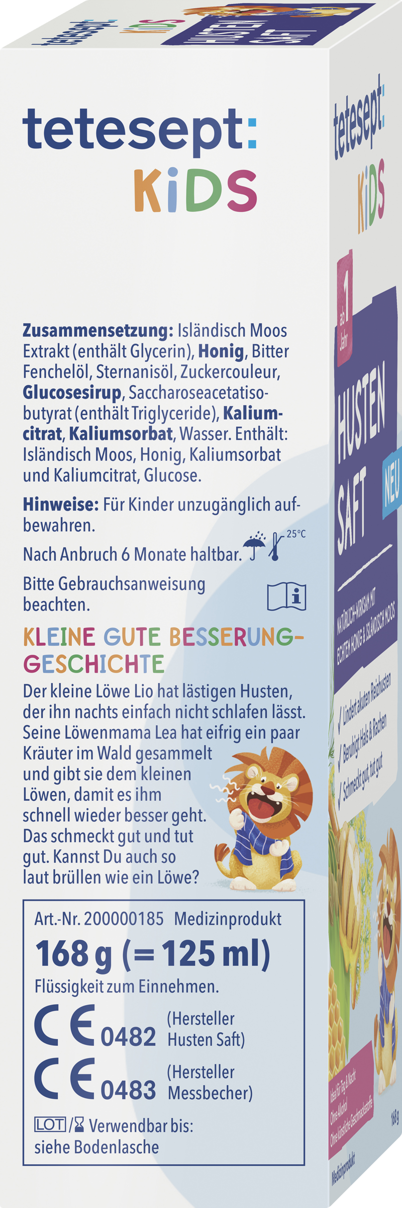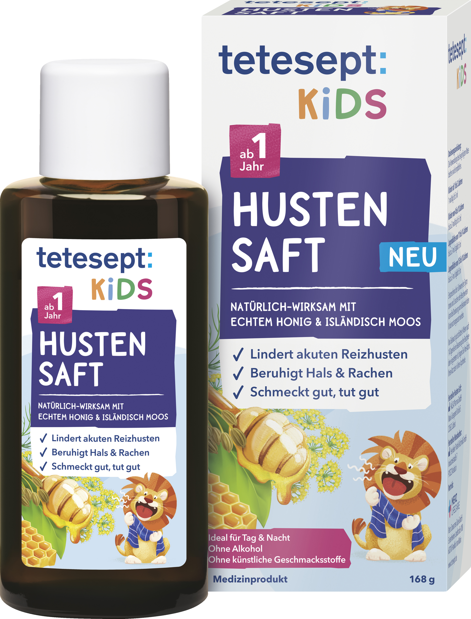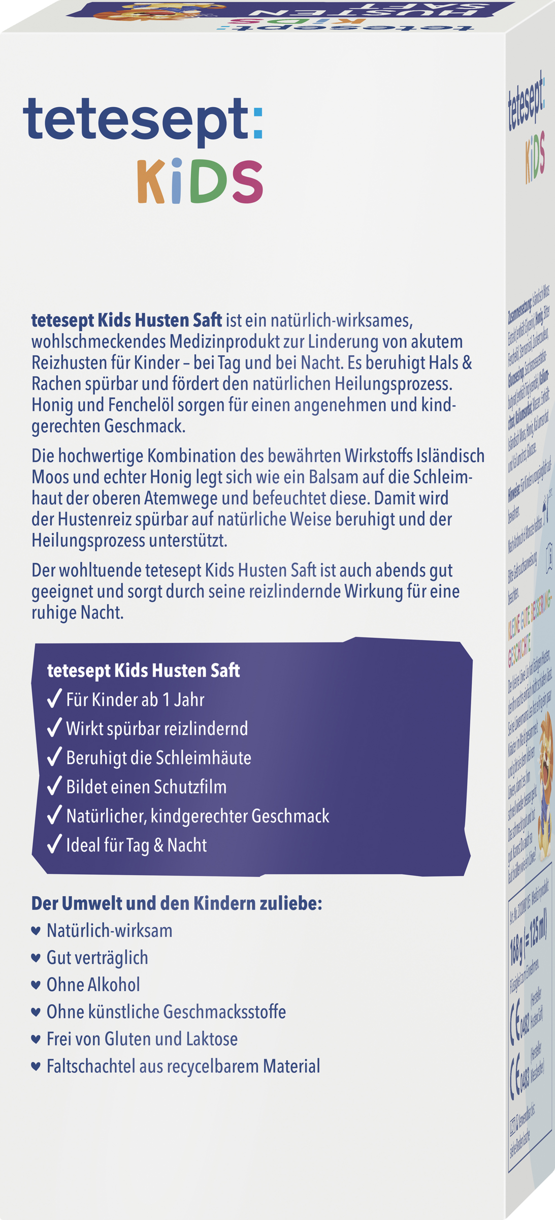 tetesept Kids Husten Saft ist ein natürlich-wirksames, wohlschmeckendes Medizinprodukt zur Linderung von akutem Reizhusten für Kinder – bei Tag und bei Nacht. Es beruhigt Hals & Rachen spürbar und fördert den natürlichen Heilungsprozess. Honig und Fenchelöl sorgen für einen angenehmen und kindgerechten Geschmack. Die hochwertige Kombination des bewährten Wirkstoffs Isländisch Moos und echter Honig legt sich wie ein Balsam auf die Schleimhaut der oberen Atemwege und befeuchtet diese. Damit wird der Hustenreiz spürbar auf natürliche Weise beruhigt und der Heilungsprozess unterstützt. Der wohltuende tetesept Kids Husten Saft ist auch abends gut geeignet und sorgt durch seine reizlindernde Wirkung für eine ruhige Nacht.