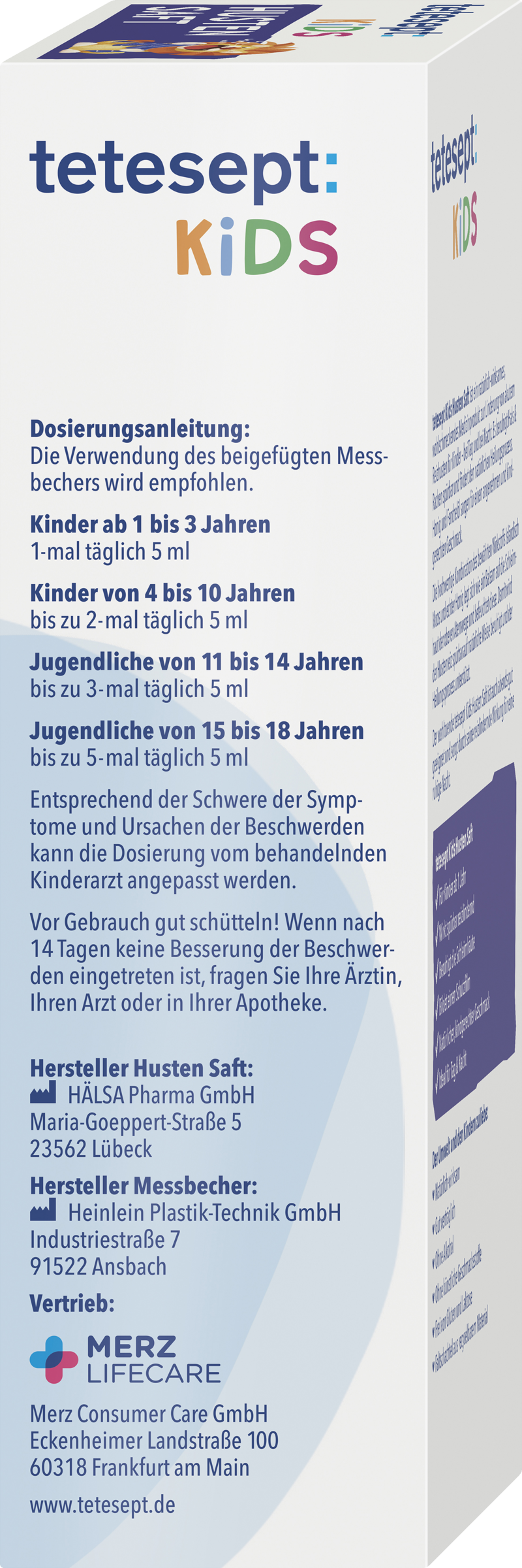 Nicht über 25°C lagern. Trocken und für Kinder unzugänglich aufbewahren. tetesept Kids Husten Saft ist nach Anbruch des Behältnisses 6 Monate haltbar. tetesept Kids Husten Saft darf nach Ablauf des auf dem Behältnis und der äußeren Umhüllung angegebenen Verfalldatums nicht mehr verwendet werden.