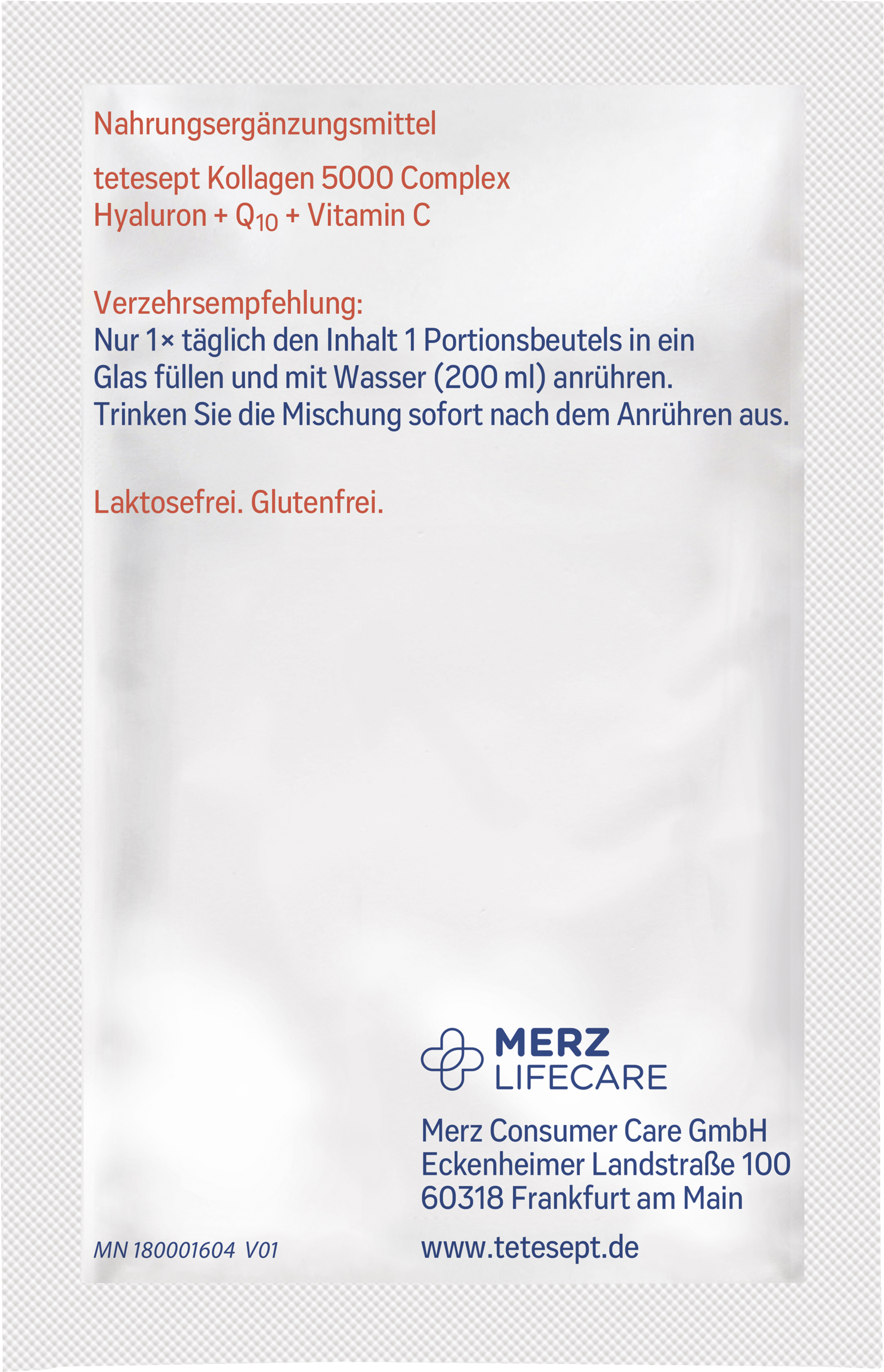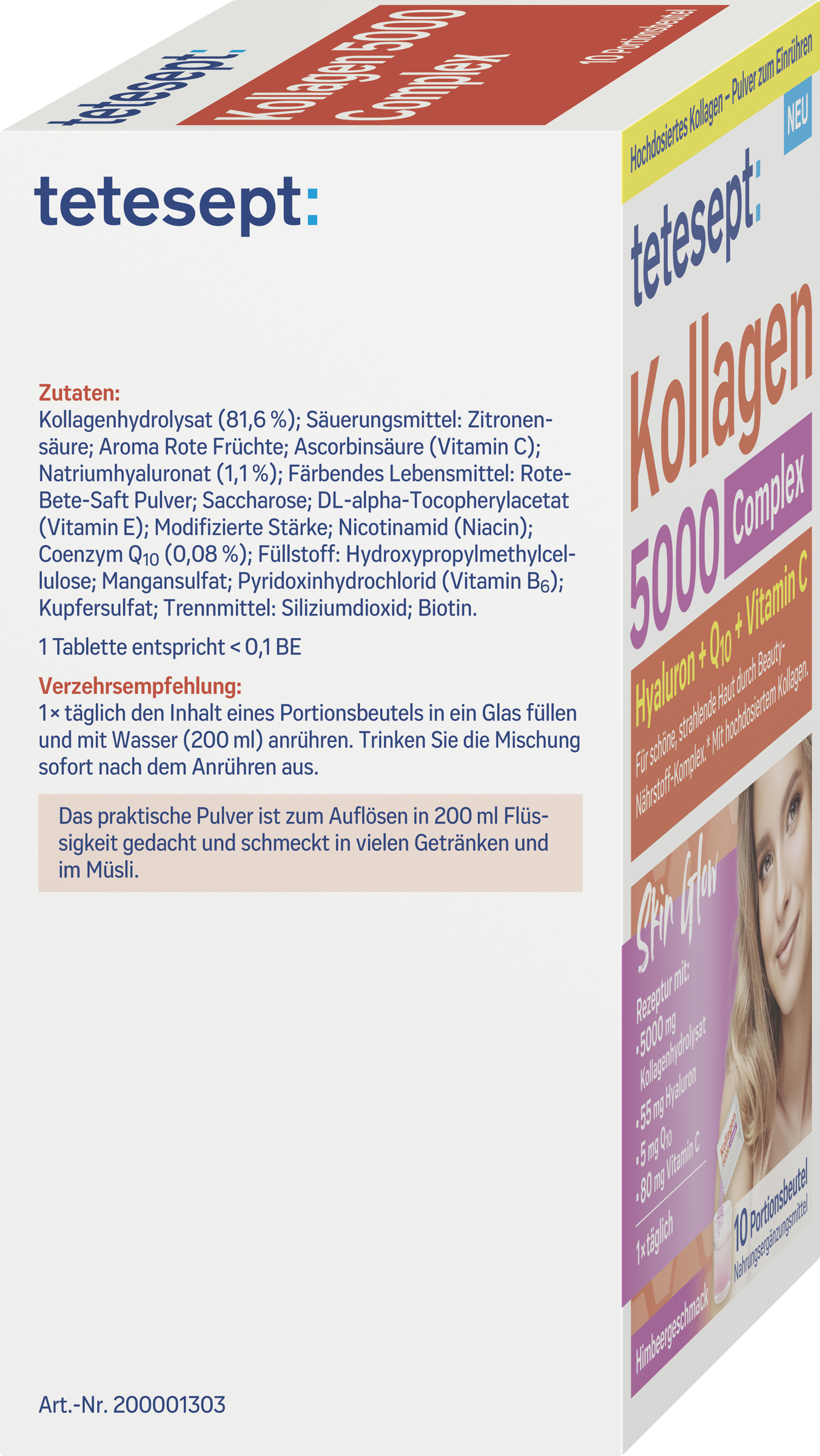 Kollagenhydrolysat (81,6%); Säuerungsmittel: Zitronensäure; Aroma Rote Früchte; Ascorbinsäure (Vitamin C); Natriumhyaluronat (1,1%); Färbendes Lebensmittel: Rote-Bete-Saft Pulver; Saccharose; DL-alpha-Tocopherylacetat (Vitamin E); Modifizierte Stärke; Nicotinamid (Niacin); Coenzym Q10 (0,08%); Füllstoff: Hydroxypropylmethylcellulose; Mangansulfat; Pyridoxinhydrochlorid (Vitamin B6); Kupfersulfat; Trennmittel: Siliziumdioxid; Biotin.