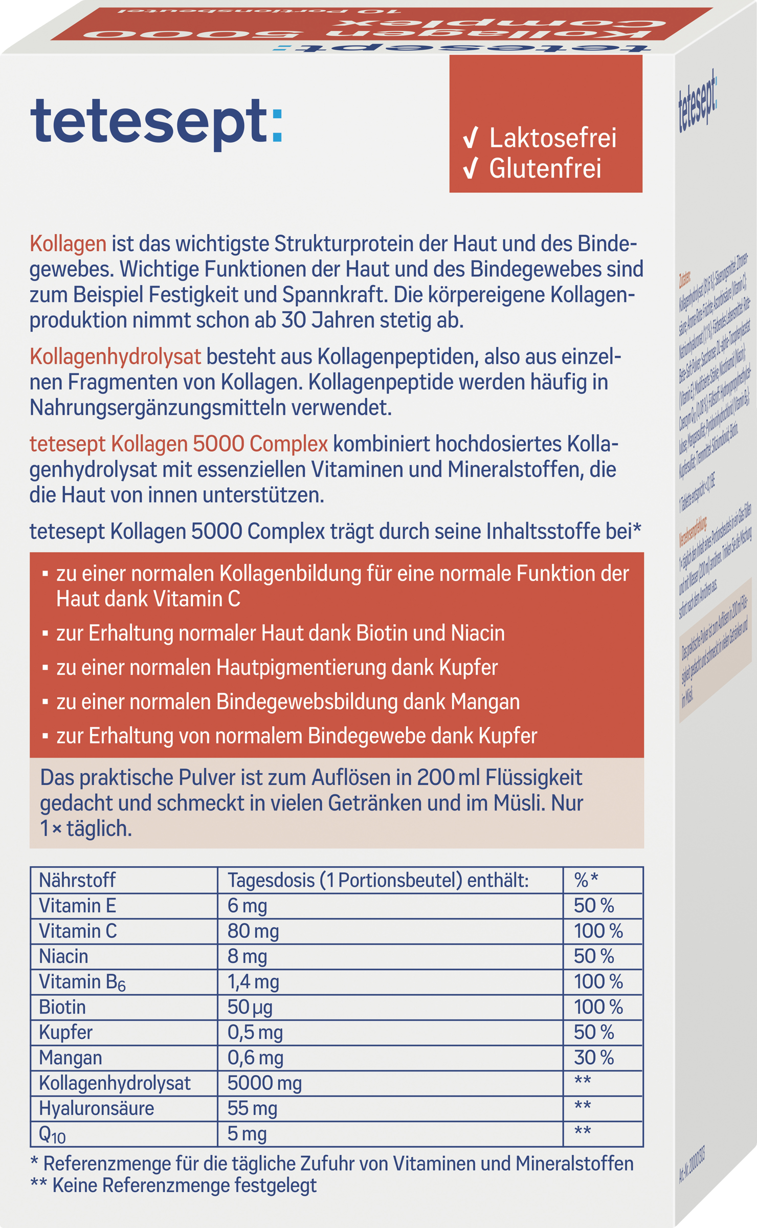 Kollagen ist das wichtigste Strukturprotein der Haut und des Bindegewebes. Wichtige Funktionen der Haut und des Bindegewebes sind zum Beispiel Festigkeit und Spannkraft. Die körpereigene Kollagenproduktion nimmt schon ab 30 Jahren stetig ab. Kollagenhydrolysat besteht aus Kollagenpeptiden, also aus einzelnen Fragmenten von Kollagen. Kollagenpeptide werden häufig in Nahrungsergänzungsmitteln verwendet. tetesept Kollagen 5000 Complex kombiniert hochdosiertes Kollagenhydrolysat mit essenziellen Vitaminen und Mineralstoffen, die die Haut von innen unterstützen.