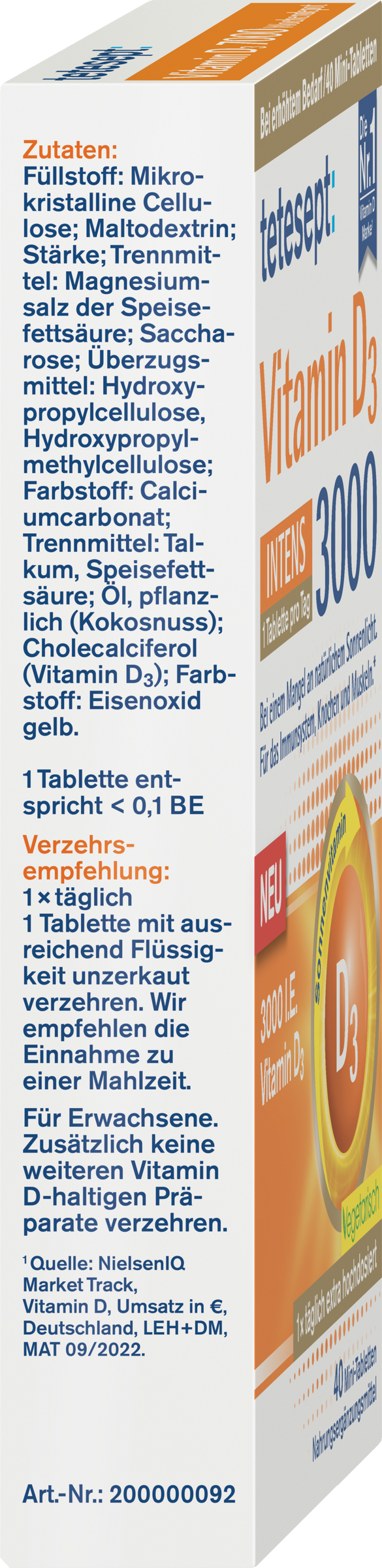 tetesept Vitamin D3 3000 Intens ist extra hochdosiert und enthält 3000 I.E. (= 75 μg) Vitamin D. Vitamin D ist wichtig für das Gleichgewicht der Körperfunktionen und trägt bei: