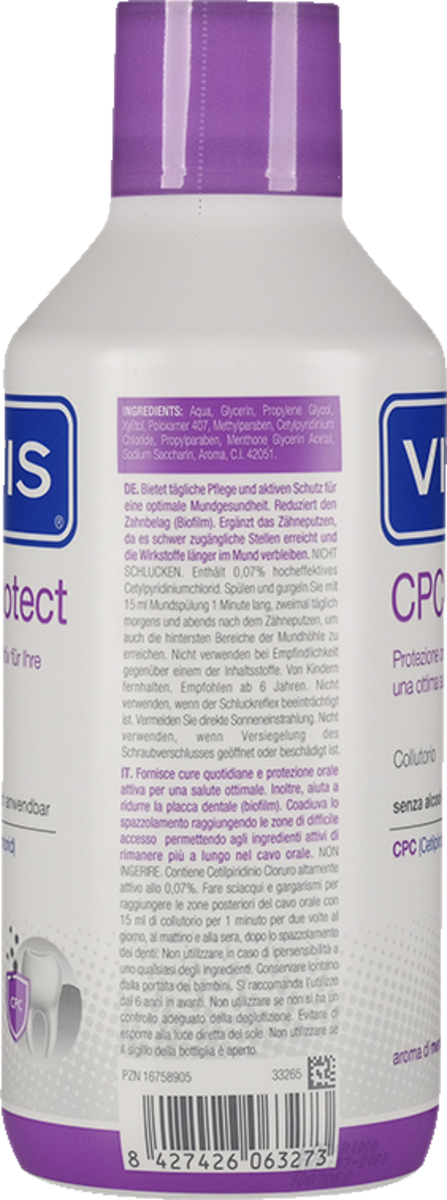 VITIS® CPC protect ist eine Mundspülung, die zur Reduzierung von Zahnbelag (Biofilm) beiträgt und dank der hohen Konzentration von Cetylpyridiniumchlorid (CPC) für einen aktiven Mundschutz sorgt. VITIS® CPC protect Mundspülung enthält eine konzentrierte Wirkstoffformel mit 0,07 % Cetylpyridiniumchlorid (CPC). Für alle, die Wert auf einen aktiven Schutz des Mundes für eine optimale Gesundheit legen. Für alle, die ihre tägliche Mundpflege durch eine zusätzliche Schutzwirkung unterstützen möchten. Geeignet für Menschen mit Zöliakie.